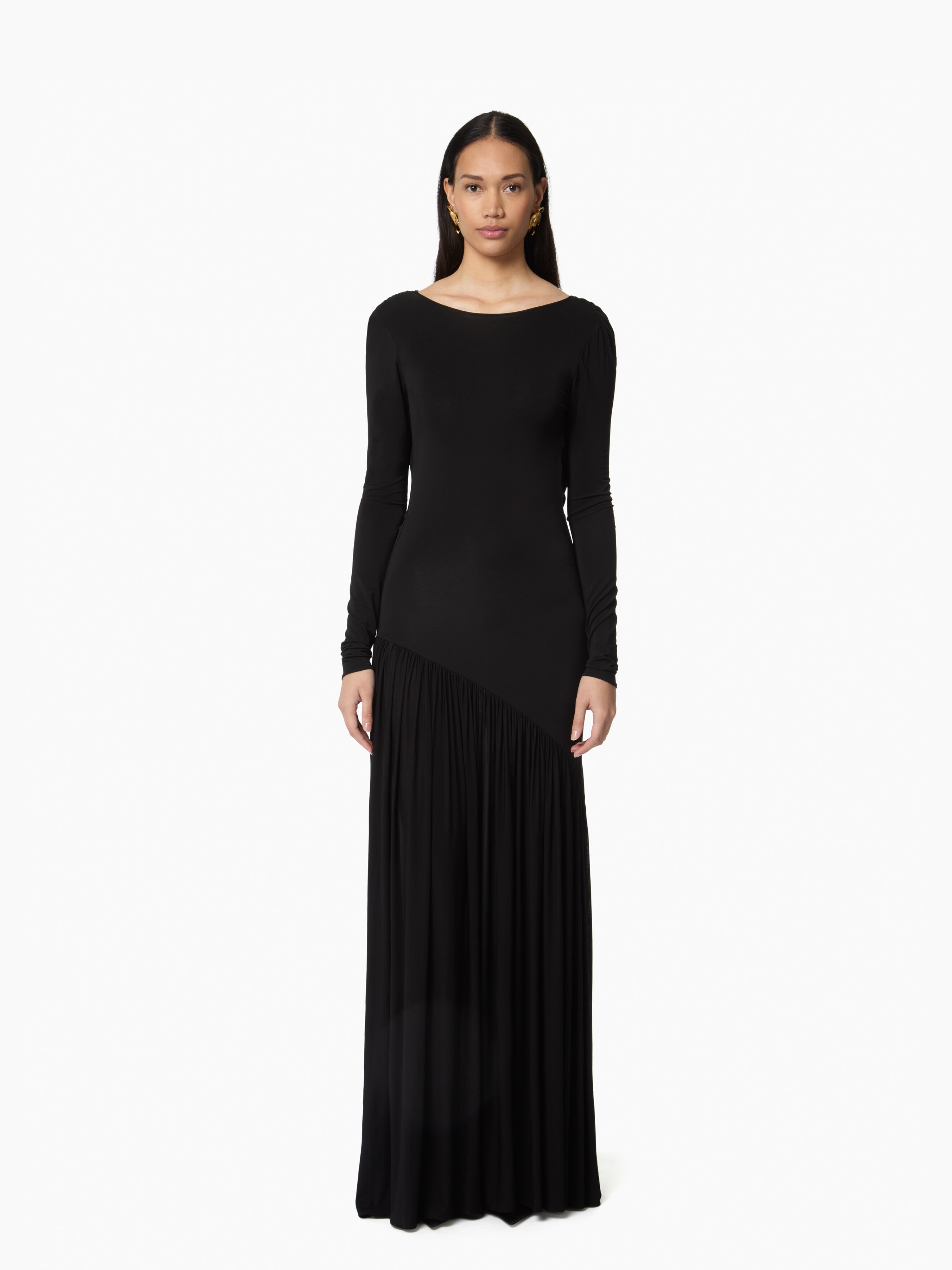 This long black dress in fluid stretch jersey features long sleeves and a refined, body-skimming silhouette. A bateau neckline offsets the delicately draped open back, while the ruched asymmetric skirt brings structure and soft movement to the look. COMPOSITION & DETAILS - 94% viscose, 6% elastane. - Fitted cut. - Maxi length. - V-shaped neckline. - Draped open back. - Model is 180 cm/ 5’11” and wears a size 36 (FR). - Ref: 25AJRO013VI0539U9000