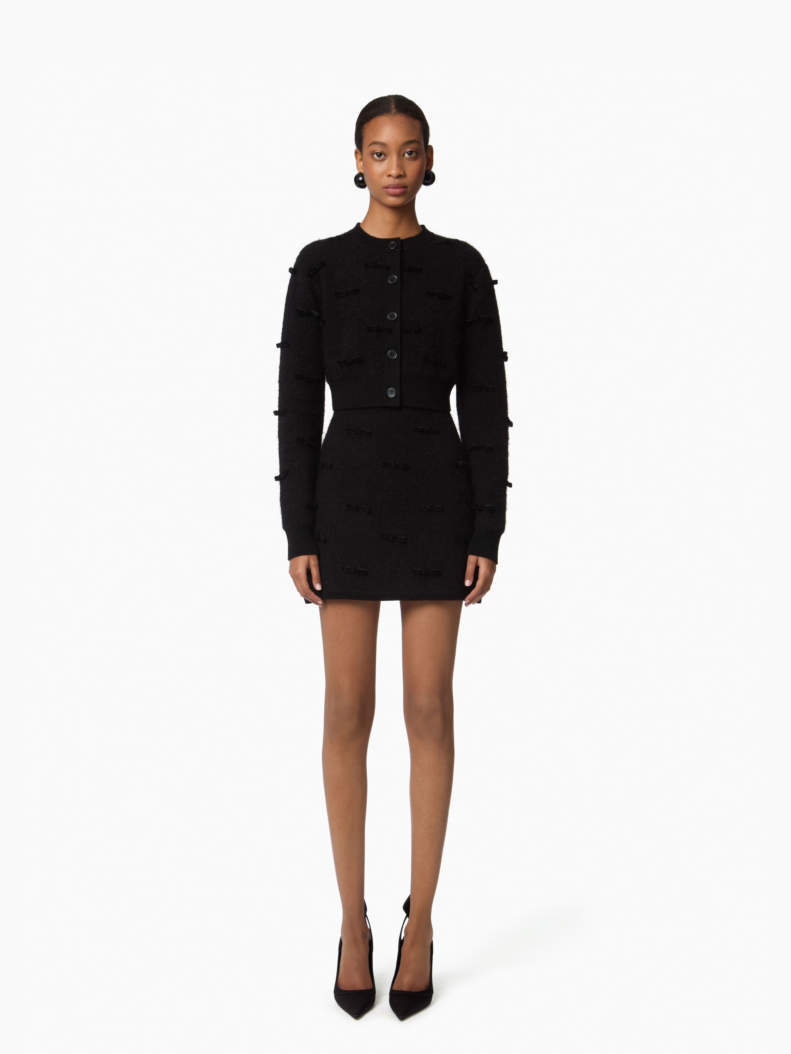 This black cardigan in mohair knit blends softness and warmth. Crafted in double-faced knit, it combines a mohair exterior with a wool interior for optimal comfort. Its cropped, fitted silhouette is framed with ribbed trims at the collar, cuffs, and hem. Tonal bows, delicately hand-stitched across the piece, add a structured and graphic twist to this feminine essential. COMPOSITION & DETAILS - 86% wool, 7% mohair, 6% polyamide, 1% elastane. - Fitted cut. - Crew neckline. - Fastens with five matching buttons. - Ribbed collar, cuffs, and hem. - Hand stitched bows. - Model is 180 cm/ 5ft 11in and wears size S. - Ref: 25AMCR007ML0585U9000