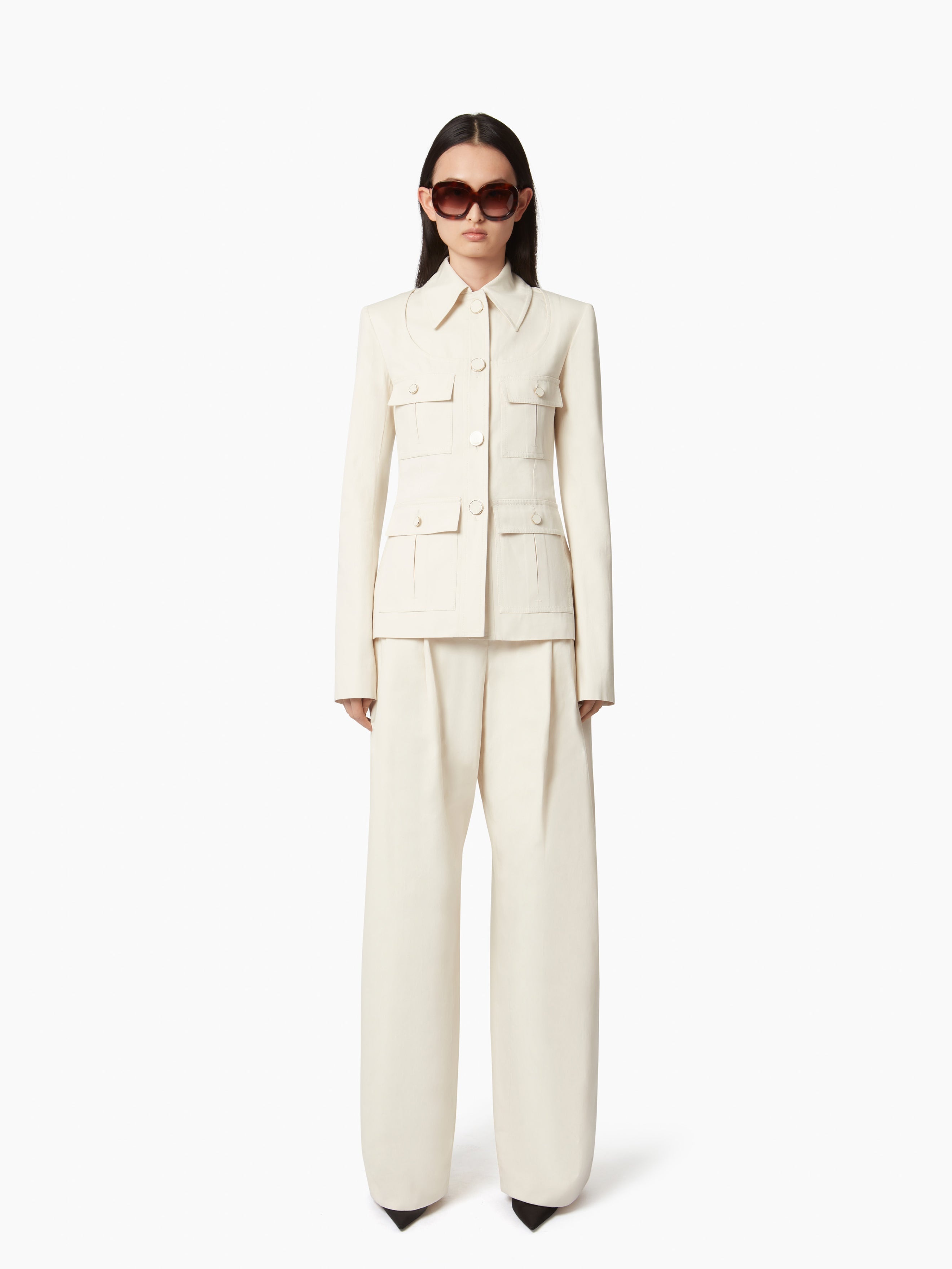 Emblematic of the Nina Ricci silhouette, the suit symbolizes timeless elegance. Harris Reed adapts and reinterprets it each season in a variety of styles. Crafted in cream cotton canvas, these pants are enhanced by a straight cut and a pleat along the leg for a unique fall. Paired with a tailored jacket from the collection, they'll stand out for a total Nina Ricci look. COMPOSITION & DETAILS - 100% cotton. - High waist. - Belt loops. - Concealed closure. - Model is 182 cm and wears a size 36 (FR). - Ref : 25PCPA002CO1086U1230