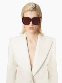 Bold and elegant, these oversized acetate sunglasses presented in the SS25 fashion show, feature wide temples with Nina Ricci’s signature gros-grain detail and sleek geometric lines, perfectly balancing the rounded bevelled front for a striking, modern look.