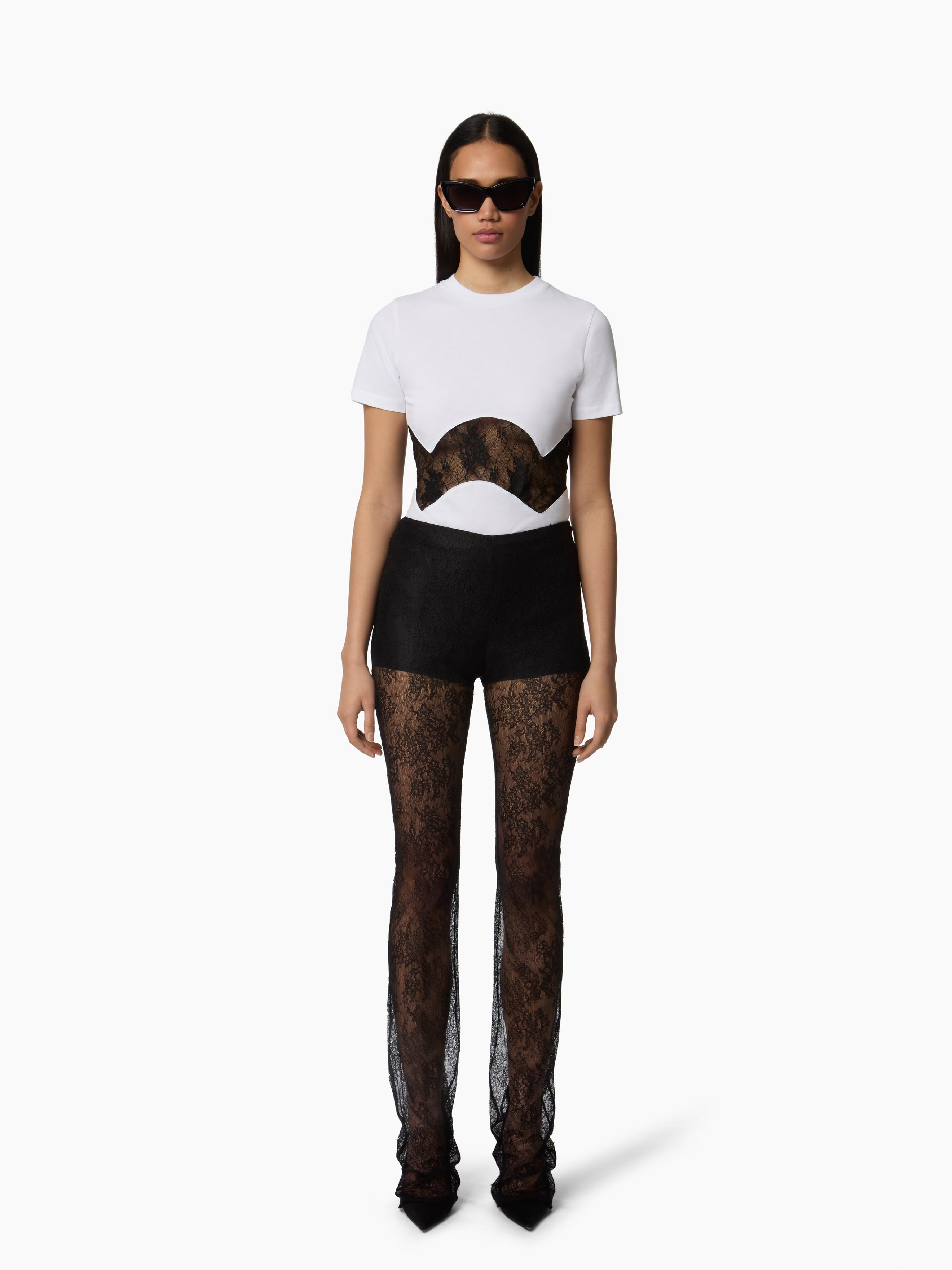 This white short-sleeved t-shirt is made from soft stretch cotton jersey and features a contrasting black lace panel across the chest. This refined, graphic detail reflects Nina Ricci’s signature aesthetic with modern elegance. COMPOSITION & DETAILS - 100% cotton. - Straight cut. - Crew neckline. - Sheer black lace insert across the chest. - Model is 178 cm/ 5ft 10in and wears a size S. - Ref: 25AJTO035CO1108U1000