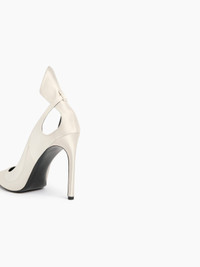 For the Fall-Winter 2025 collection, Harris Reed reintroduces these cream satin pumps. The heel is elegantly wrapped in openwork detailing that echoes the shape of a bow—a signature motif of Maison Nina Ricci. Designed to elevate every silhouette of the season, these pumps add a boldly feminine finishing touch. COMPOSITION & DETAILS - 72% viscose, 28% silk. - Satin upper. - 110mm heel. - Available in 5 sizes. - If you are between two sizes, choose the smaller one. - Ref: 25ACC0057SAT009U1230