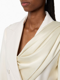 This cream wool gabardine double-breasted blazer stands out as a signature piece from the Nina Ricci Fall-Winter 2025 collection. Its structured silhouette is enhanced by a fluid satin built in scarf detail, creating a refined mix of textures. Blending classic tailoring with a couture sensibility, this jacket defines a bold and sophisticated silhouette. COMPOSITION & DETAILS - 100% virgin wool. - Regular fit - Fitted waist. - Integrated satin scarf. - Button closure with matching buttons. - 2 flap pockets. - Six-button front. - Model is 178 cm/ 5ft 10in and wears a size 36 (FR). - Ref: 25ACVE006WV0324U1230