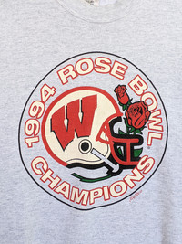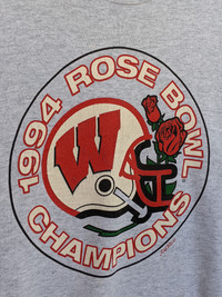 B4 Please read descriptions and policy before buying, contact me for questions about this item. Tag Brand : Fruit Of The Loom Size On Tag : XL Actual Size Measurements :- - Arm Pit To Arm Pit : 25” inches - Back Collar/Neck To Hem : 28.5” inches - Sleeve Length : 23.5" inches CONDITIONS :- - Good conditions,nice colour and print. - No stain or defect, excellent vintage 90s condition,made in usa. - Played on January 1, 1994. It was the 80th Rose Bowl Game. The Wisconsin Badgers defeated the UCLA Bruins 21–16. - See our listing for full details and description of any imperfections. - Please don’t expect it to be like new or in pristine condition (used clothing). DELIVERY/POSTAGE :- - DHL Express/Expedited = 5-8 business day. (Message me first) - Standard Shipping/Economy/Flexipack= 10-17 business day Shop Policy - No refund after buy!!