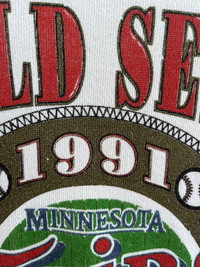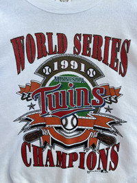 B2 Please read descriptions and policy before buying, contact me for questions about this item. Tag Brand : SSI Size On Tag :L Actual Size Measurements :- - Arm Pit To Arm Pit : 22” inches - Back Collar/Neck To Hem : 25” inches - Sleeve Long : 22” inches CONDITIONS :- - Good condition,nice colour and print. - Have little yellowish stain,made in Usa,excellent vintage sweatshirt -The 88th edition of the World Series,it was a best-of-seven playoff played between the American League (AL) champion Minnesota Twins (95–67) and the National League (NL) champion Atlanta Braves (94–68). The Twins defeated the Braves four games to three to win the championship. - See our listing for full details and description of any imperfections. - Please don’t expect it to be like new or in pristine condition (used clothing). DELIVERY/POSTAGE :- - DHL Express/Expedited = 5-10 business day. (Message me first) - Standard Shipping/Economy/Flexipack= 10-20 business day Shop Policy - No refund after buy!!