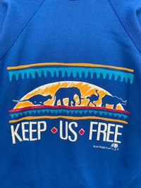 C10 Please read descriptions and policy before buying, contact me for questions about this item. Tag Brand : Artex Size On Tag : XL Actual Size Measurements :- - Arm Pit To Arm Pit : 24” inches - Back Collar/Neck To Hem : 28” inches - Sleeve Lenght : CONDITIONS :- - Very Good conditions,nice Colour and Print. - No stain or defect,excellent vintage condition. - 80s WWF campaign for animal,with slogans “KEEP US FREE”. - See our listing for full details and description of any imperfections. - Please don’t expect it to be like new or in pristine condition (used clothing). DELIVERY/POSTAGE :- - DHL Express/Expedited = 5-10 business day. (Message me first) - Standard Shipping/Economy/Flexipack= 10-20 business day Shop Policy - No refund after buy!!