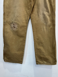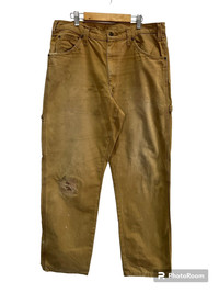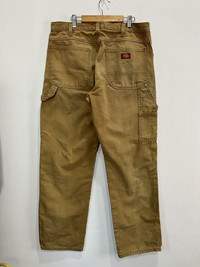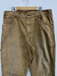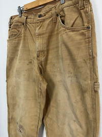 Vintage Dickies Carpenter Pants Camel Tan Canvas Baggy Fit Dungarees Work Wear Painters 90s Skate / Streetwear PLEASE REFER TO ALL THE PICTURES PROVIDED FOR THE CONDITION ⚠️ Got zigzag patched perfectly on the knee ⚠️ Marks and stains Men's Size: Waist: 33" Length (outseam): 41.5" Leg Opening: 8.5" Thigh Opening: 14" Front Rise: 12.5" Shipping: Canada $25 Other Countries: $35