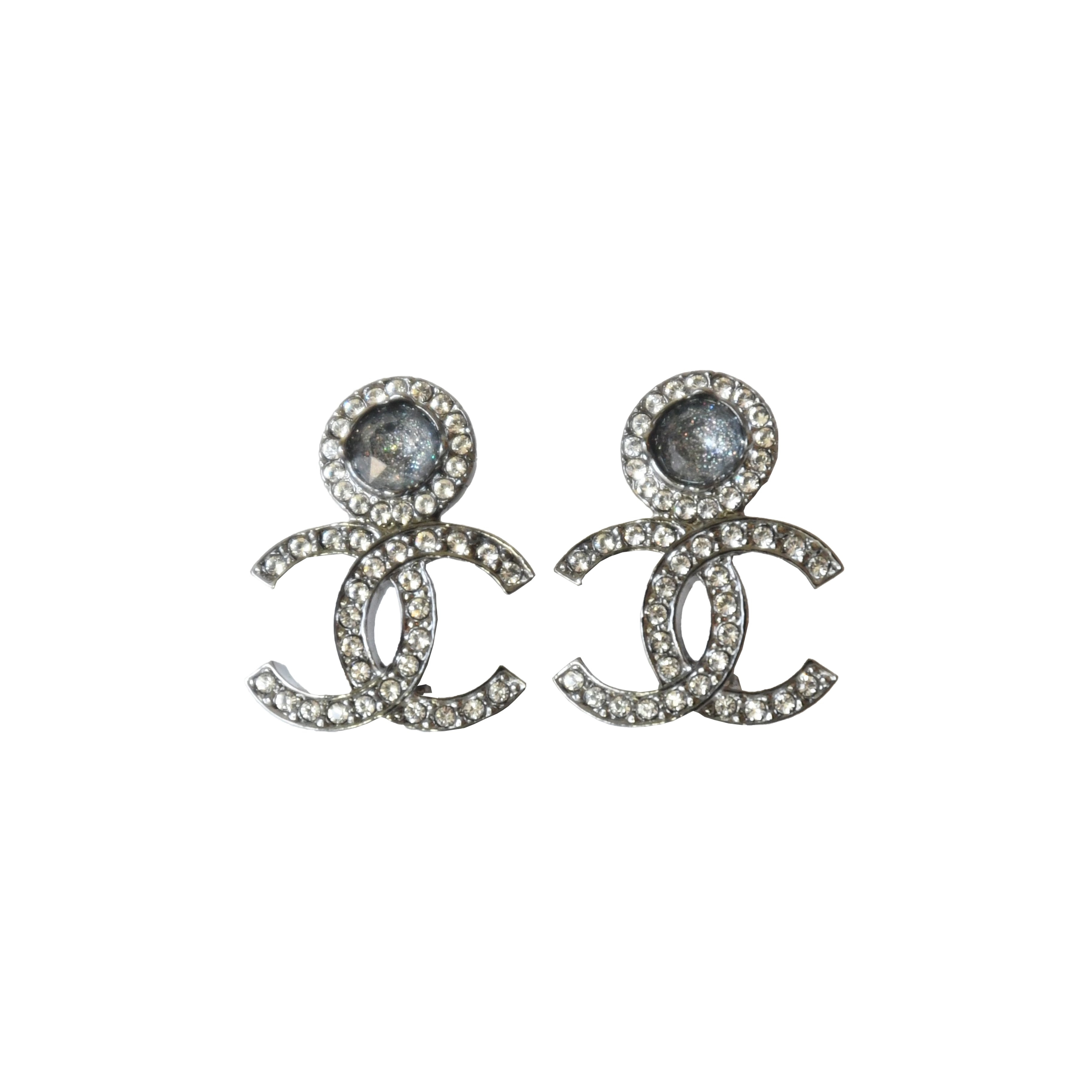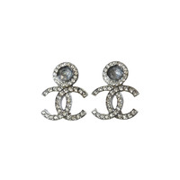 Chanel 23B CC Stud Grey Crystal Strass Earrings Sliver