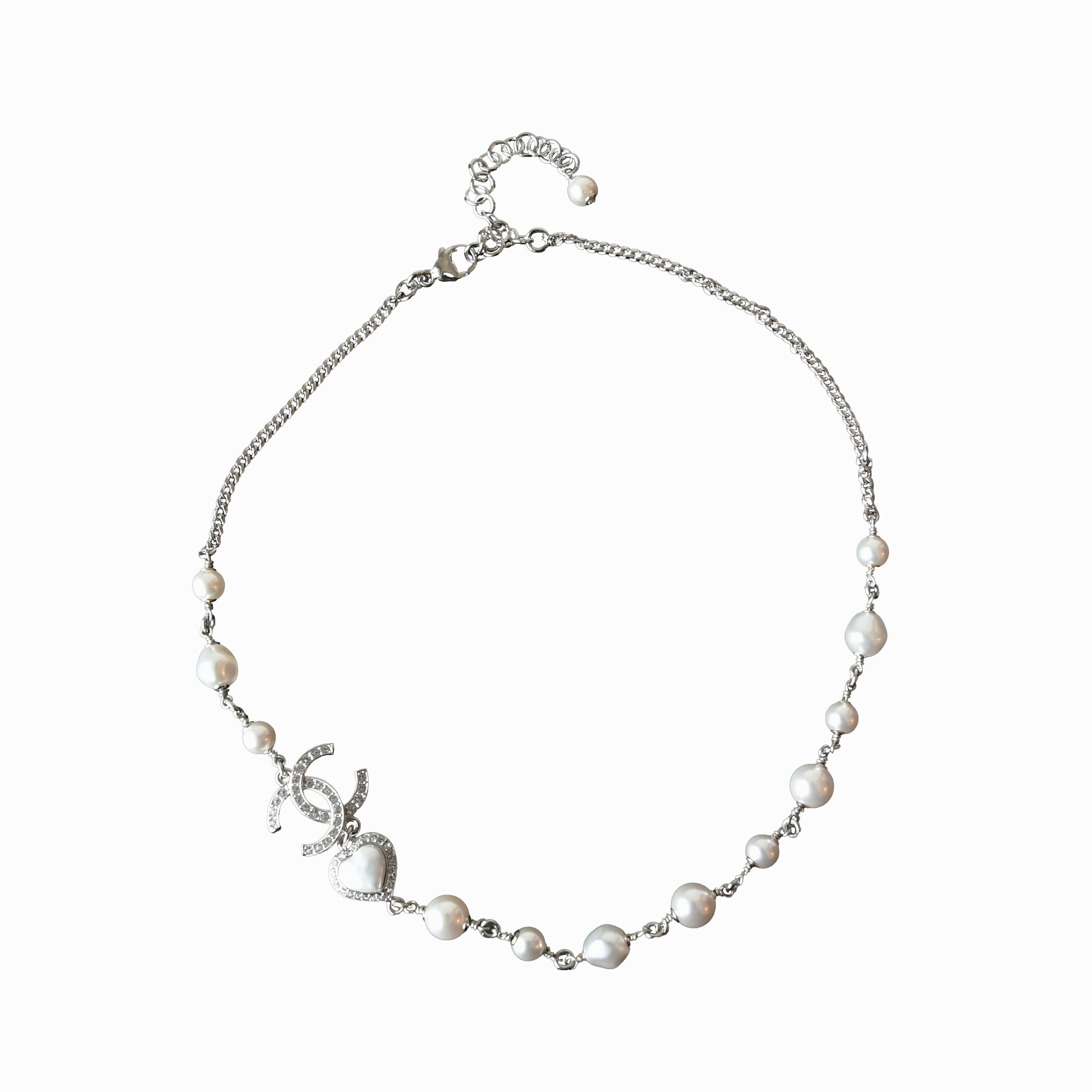 Chanel 23B Crystal Strass CC Heart Pearl Necklace Silver