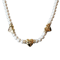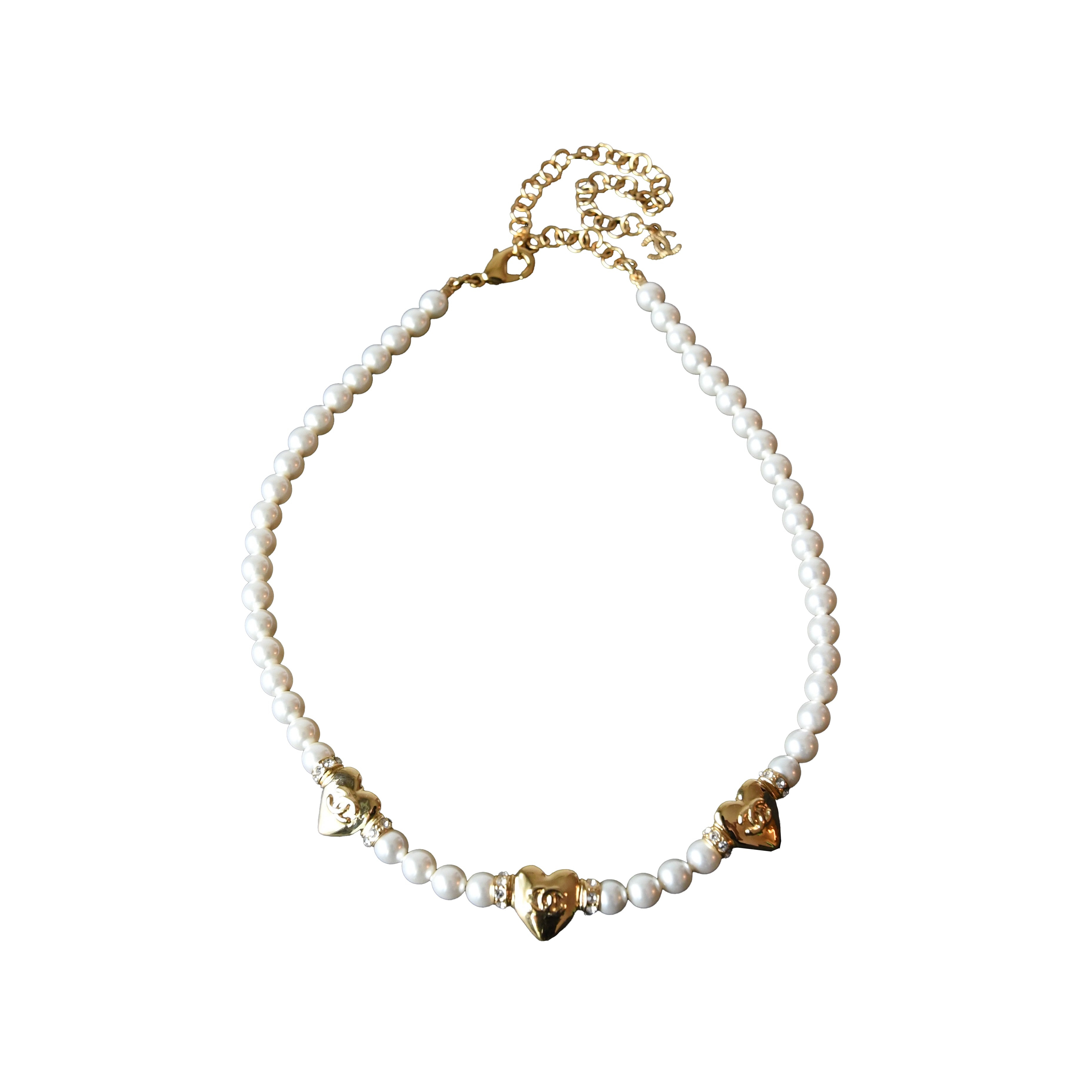 Chanel 24P CC Logo Metal Heart With Crystal Strass Pearl Necklace Gold White