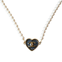 Chanel 24P Metal Denim CC Heart Choker With Pearl Necklace Gold Blue Pearly White