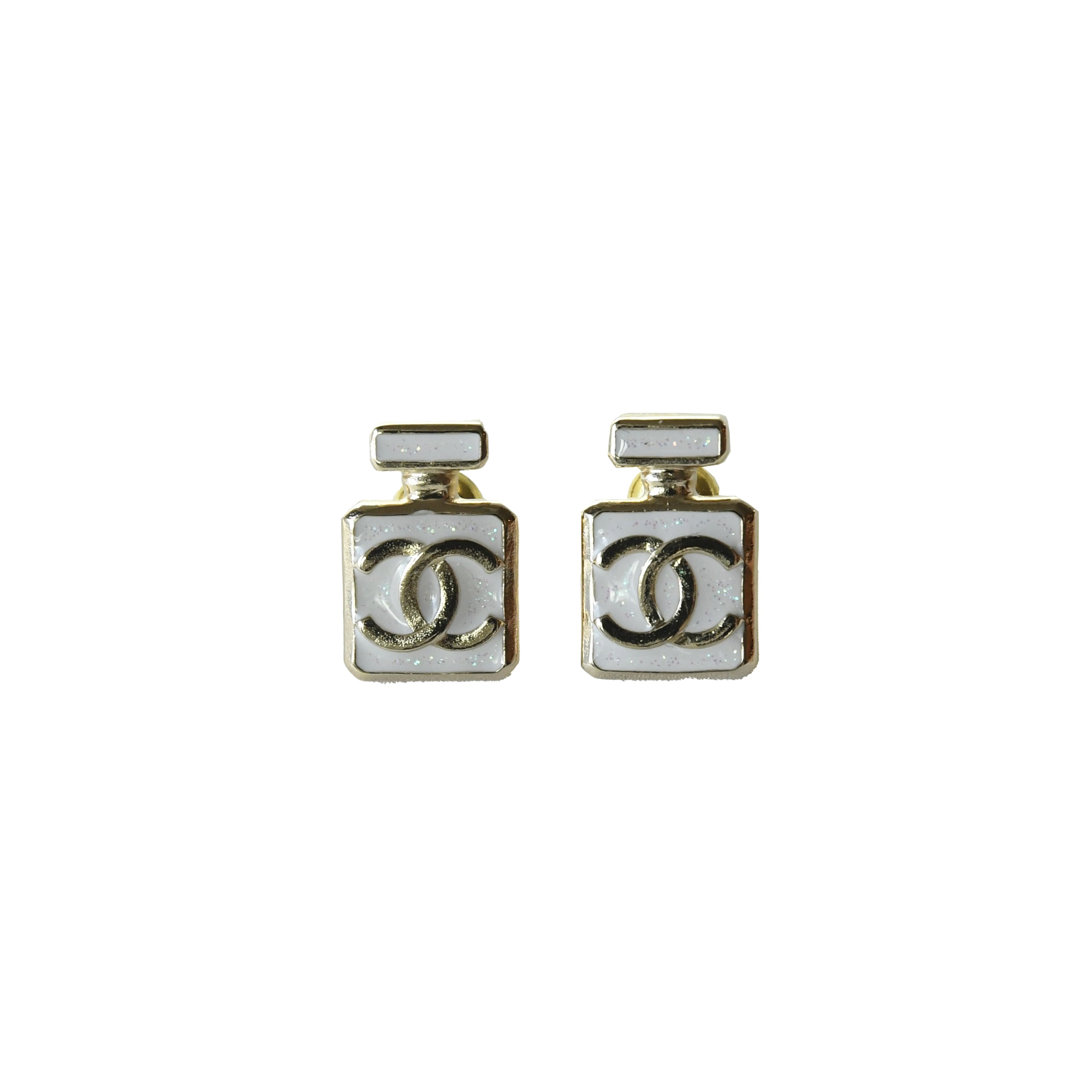Chanel 25P CC Enamel Perfume Bottle Stud Earrings White