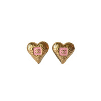 Chanel CC Enamel Heart Stud Earrings Gold