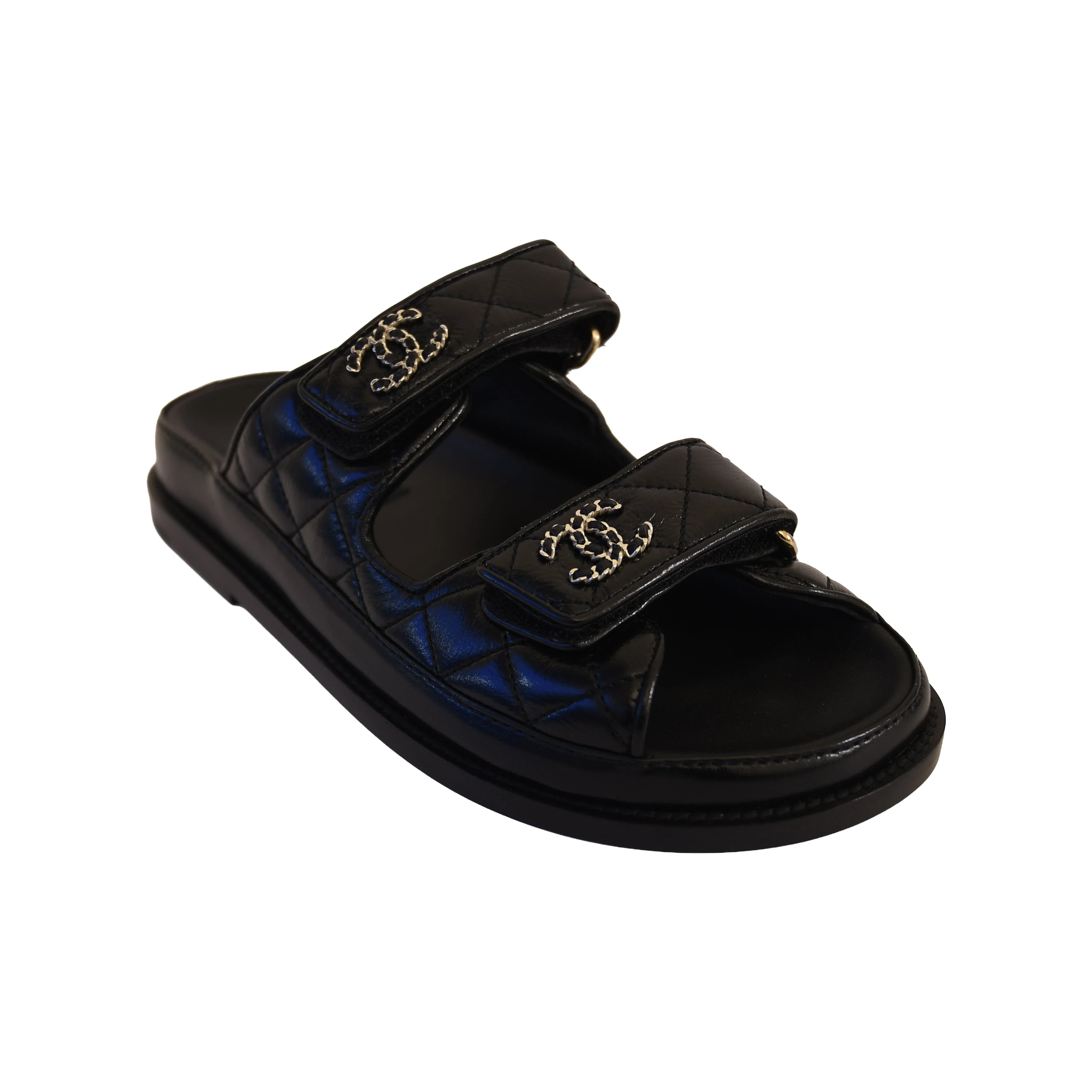 Chanel CC logo Quilted Lambskin Velcro Dad Sandals Black