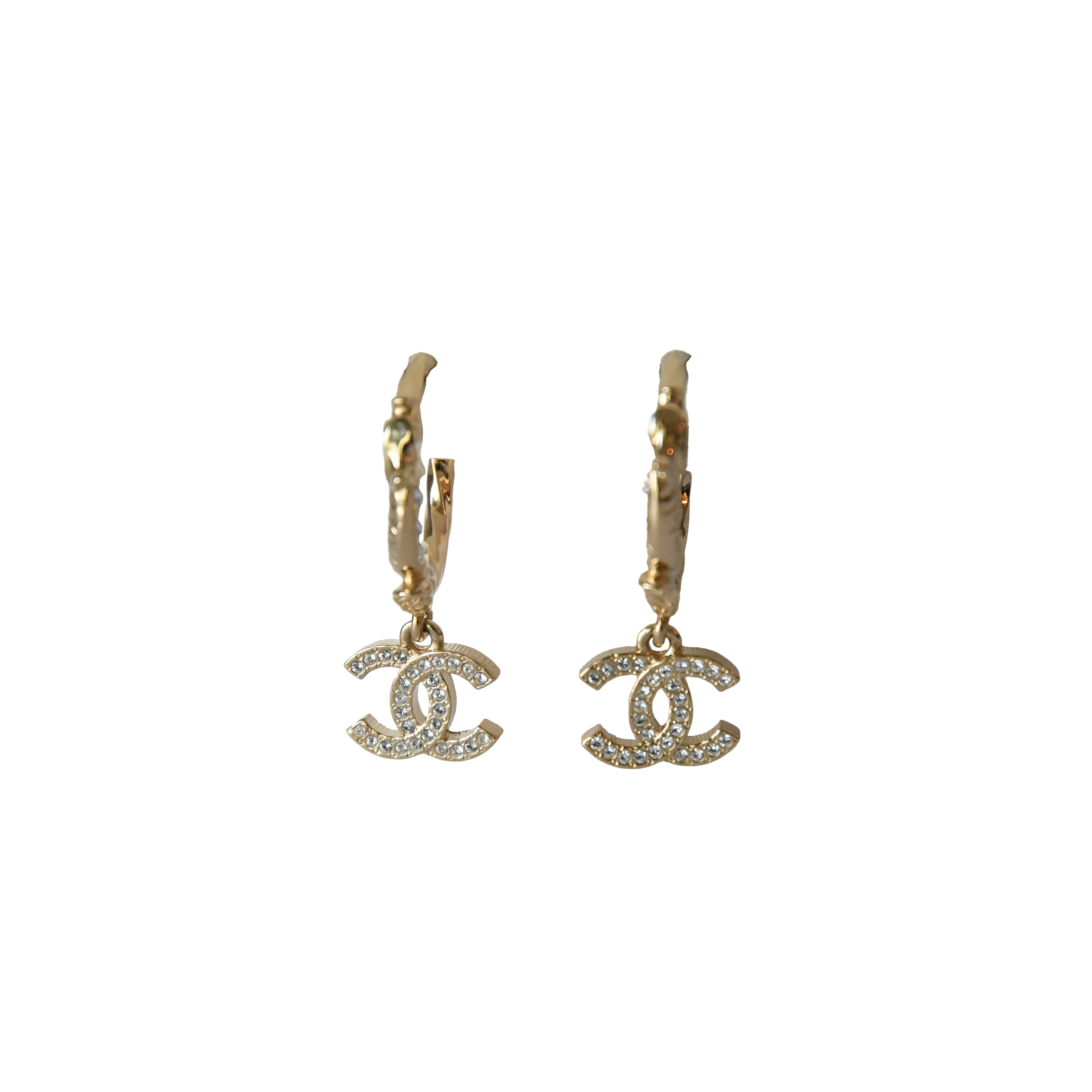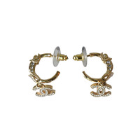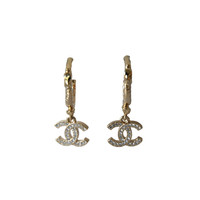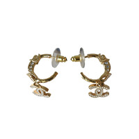 Chanel CC Metal Crystal Strass Studded Hoop Drop Earrings Gold