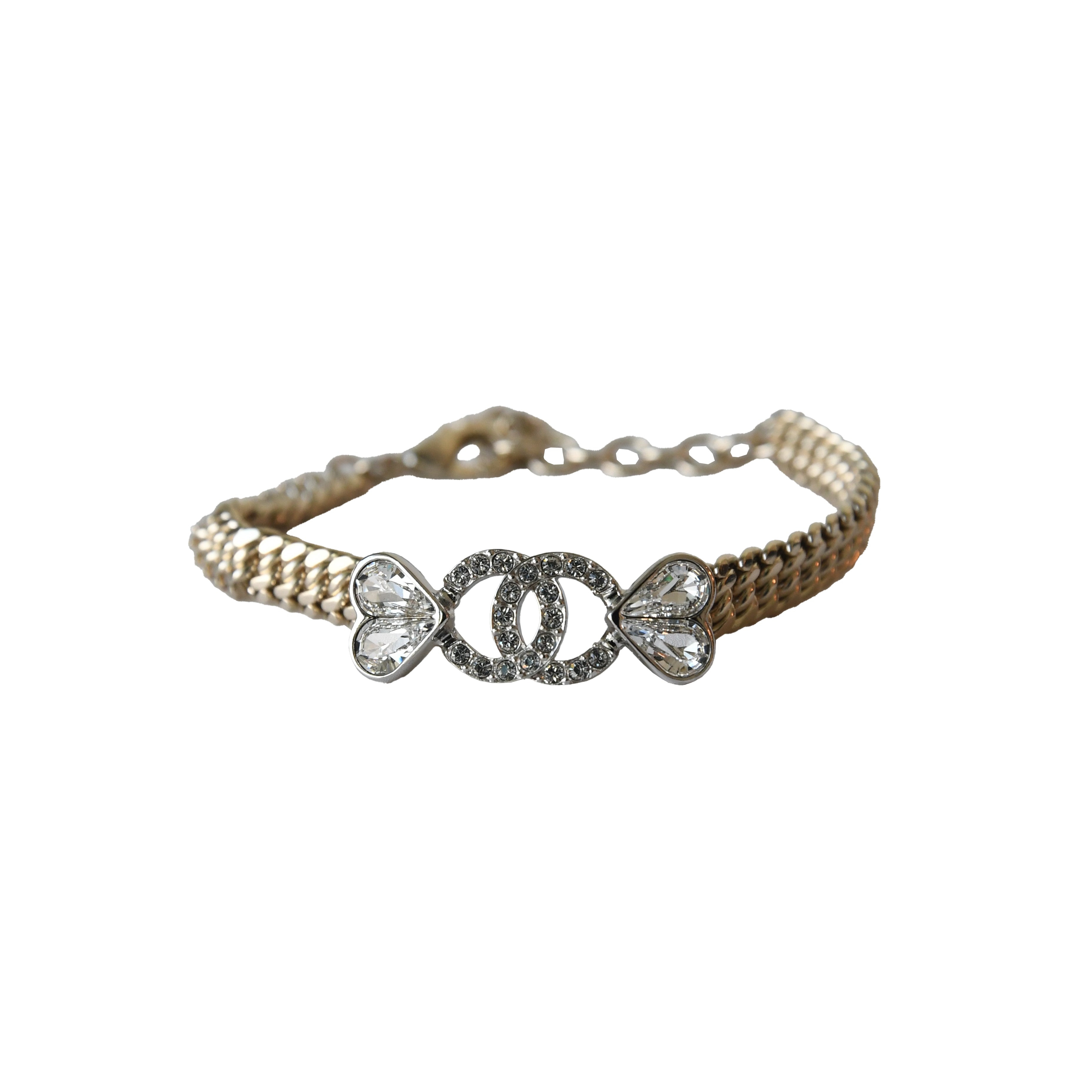 Chanel Crystal Strass CC Heart Chain Bracelet Gold