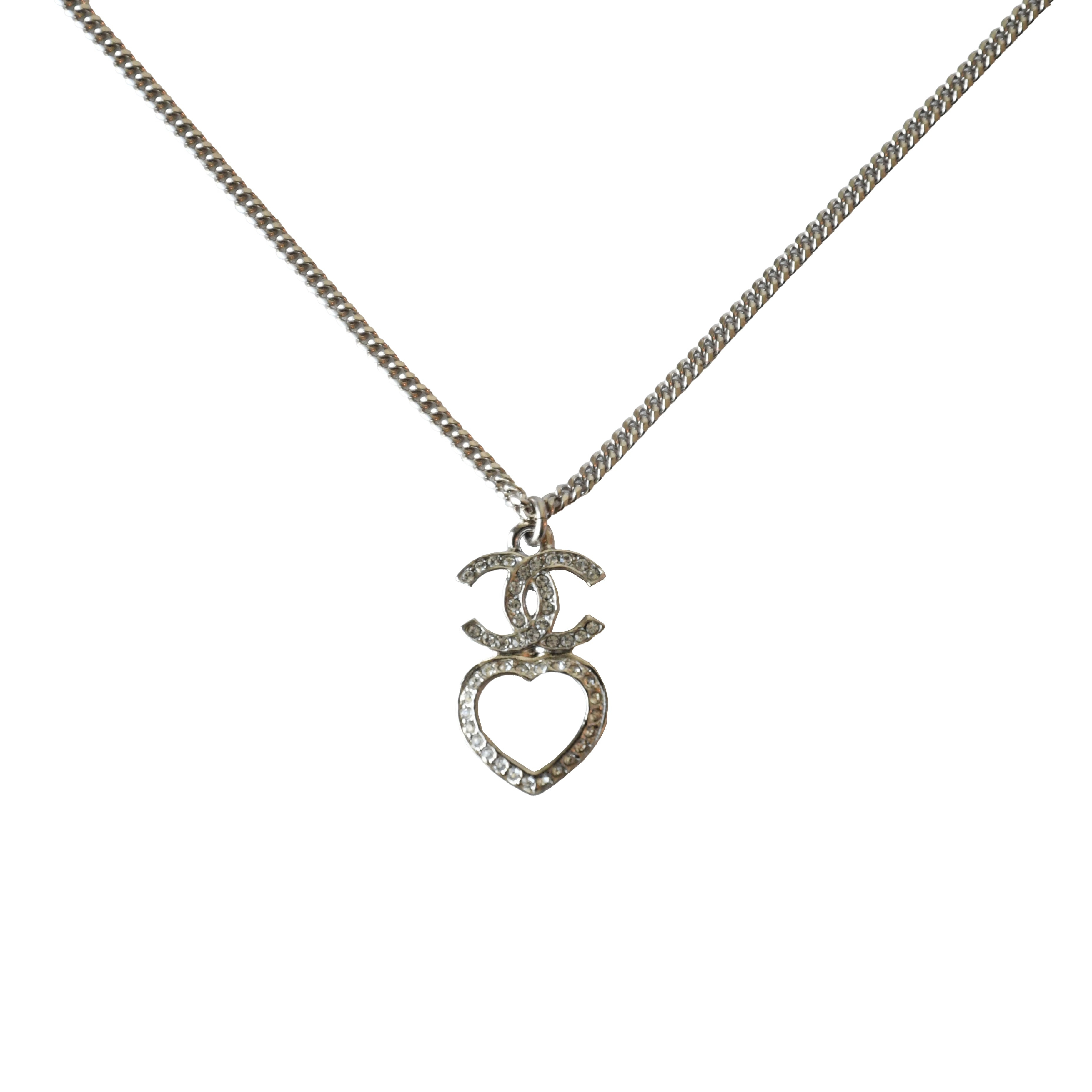 Chanel Crystal Strass CC Heart Pendant Necklace Silver