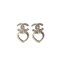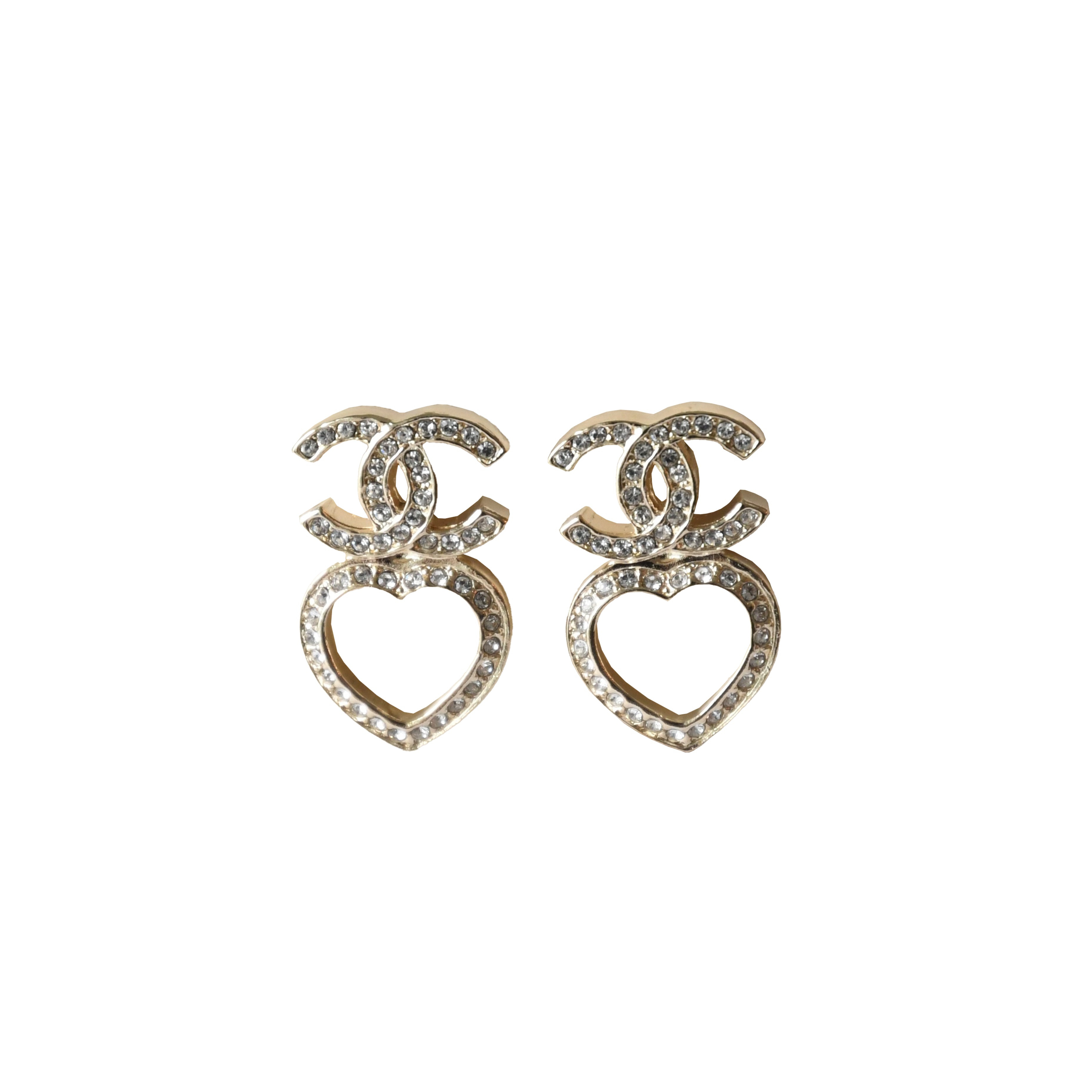 Chanel Crystal Strass CC Heart Stud Earrings Light Gold