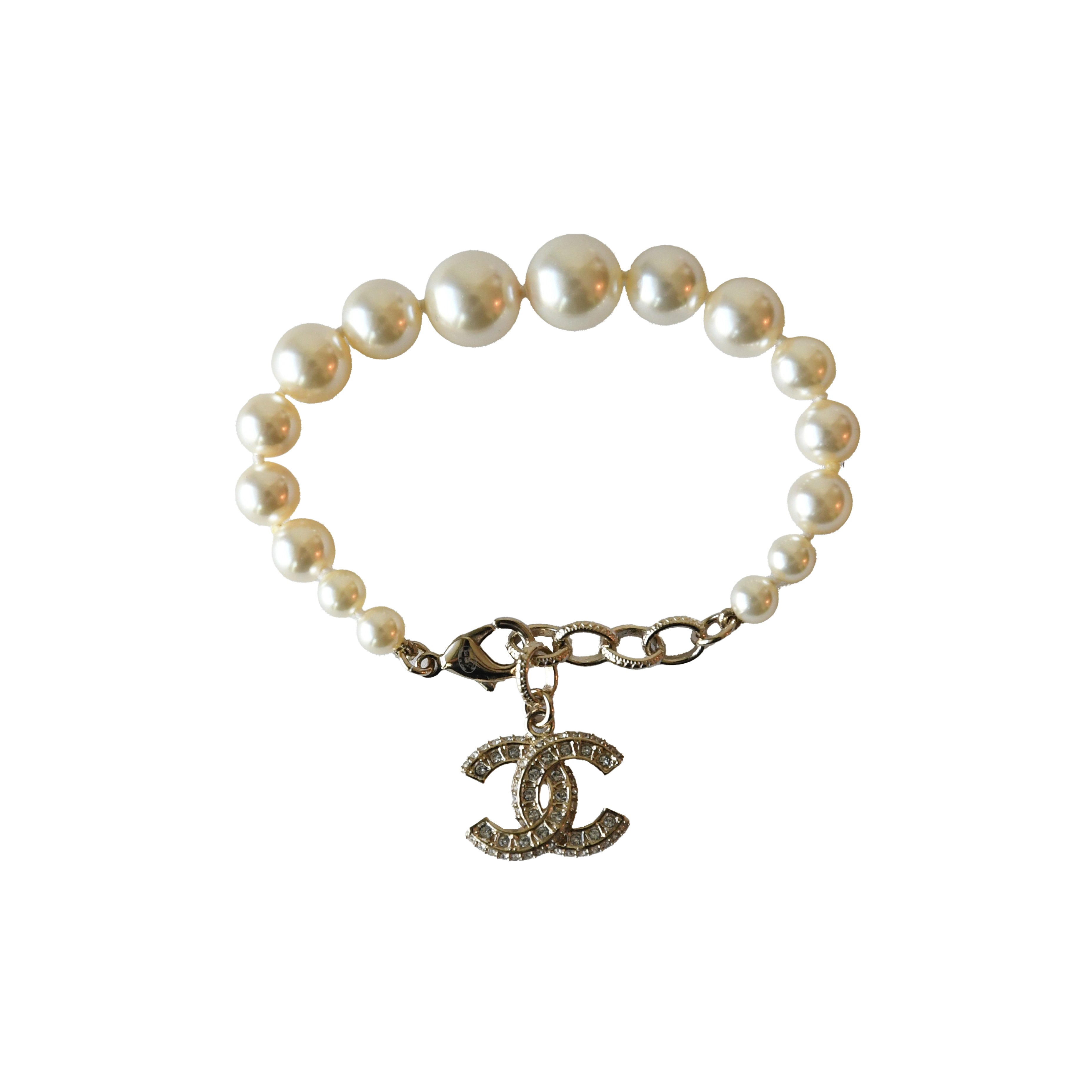 Chanel Crystal Strass Resin CC Pendant Pearl Bracelet Gold