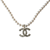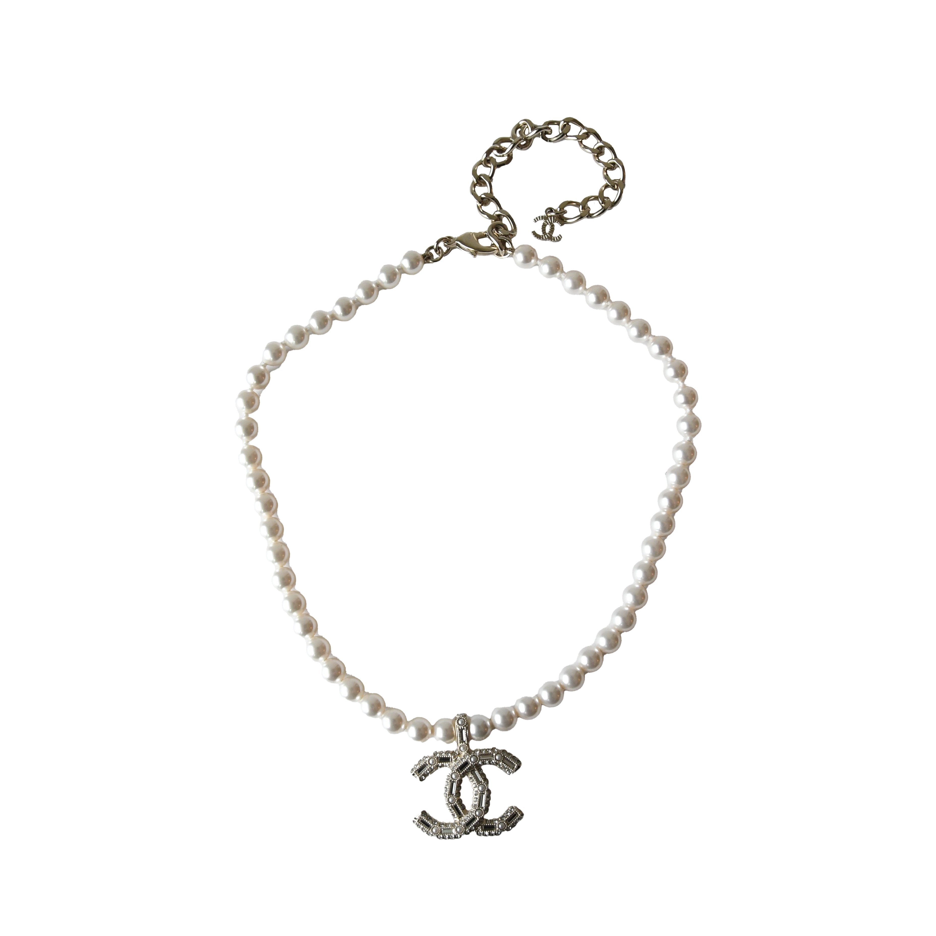 Chanel Crystal Strass Resin CC With Pearl Necklace White Light Gold