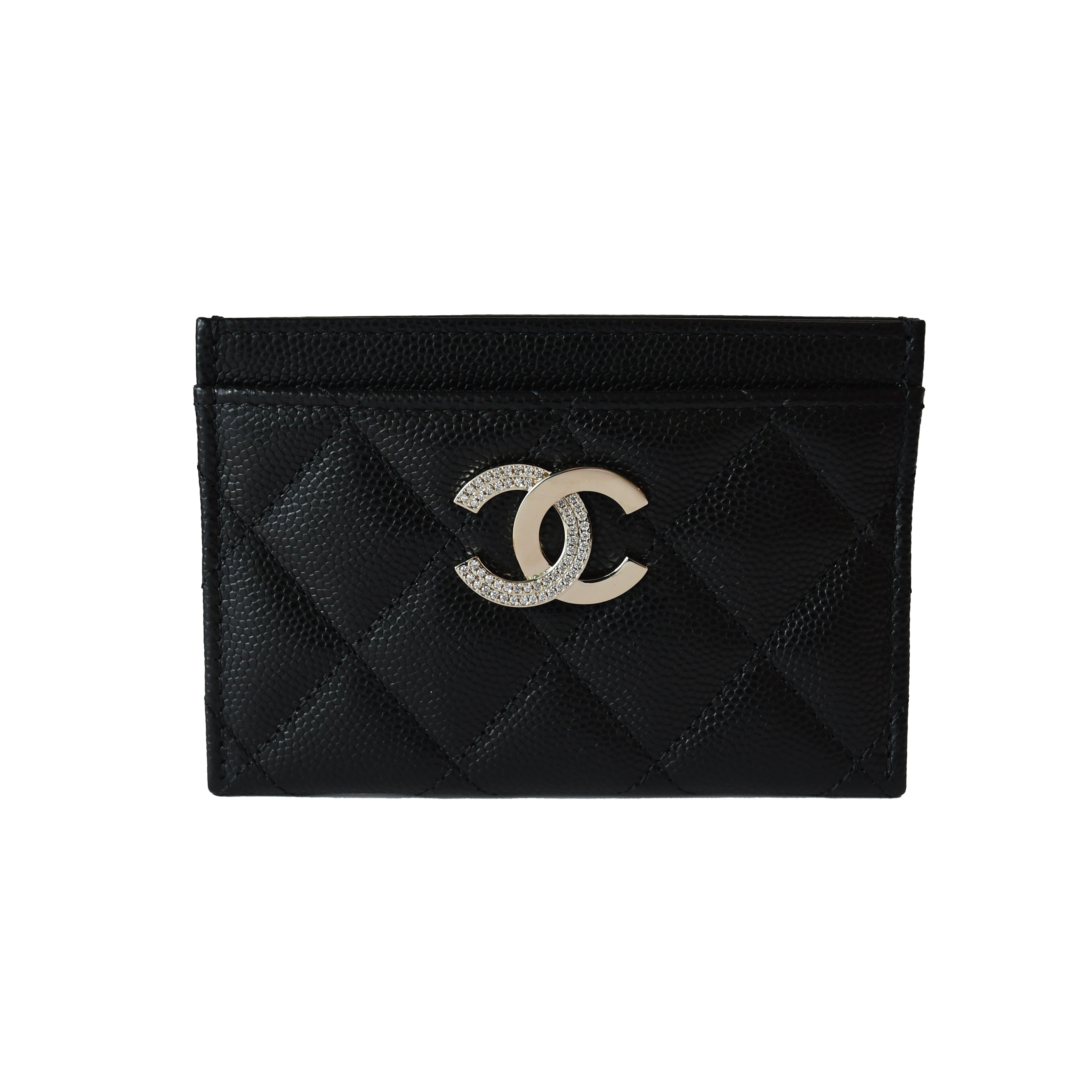 Chanel Metal Crystal Strass CC Logo Quilted Leather Card Holder Black