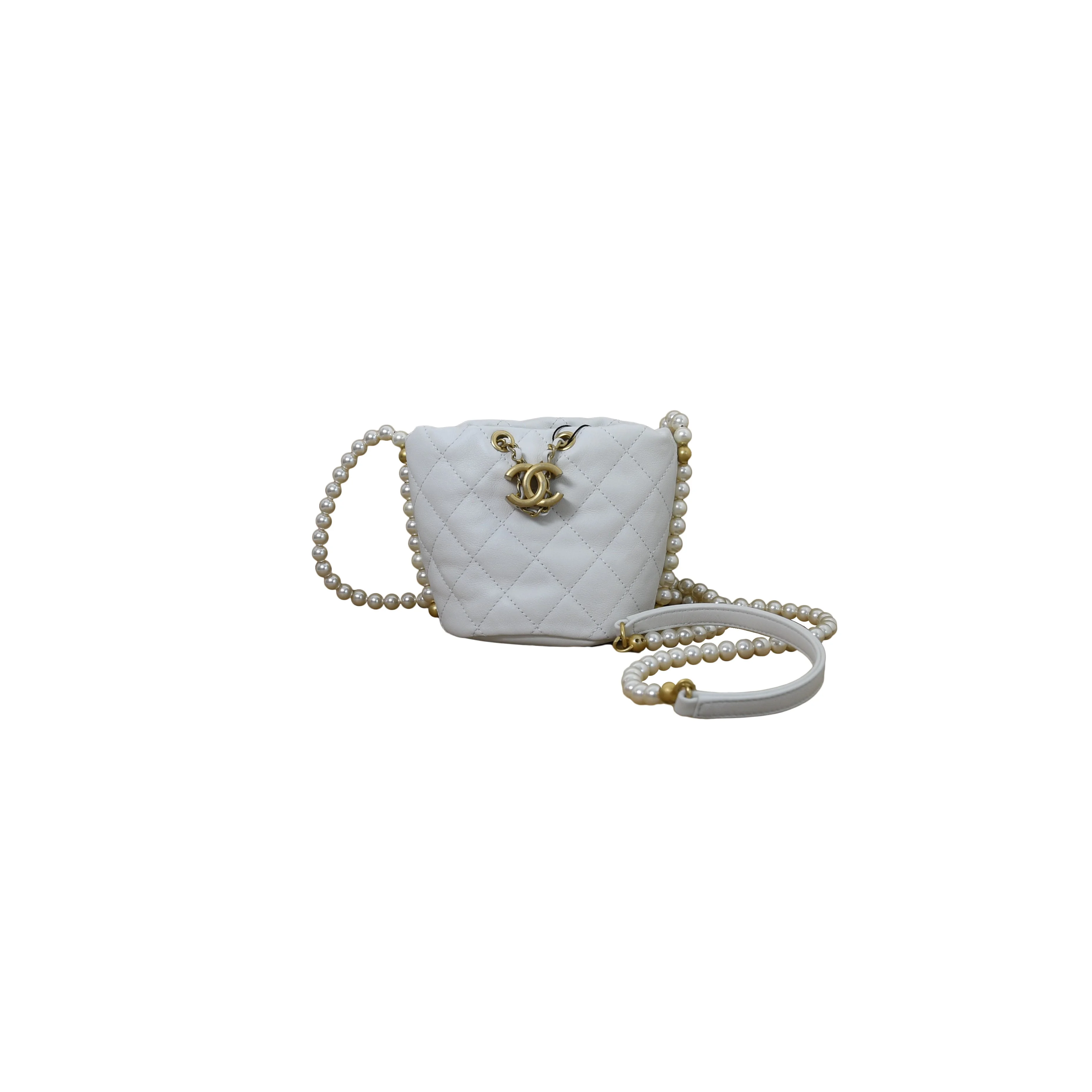 Chanel Mini Drawstring Bag Calfskin Pearl with Gold Metal White