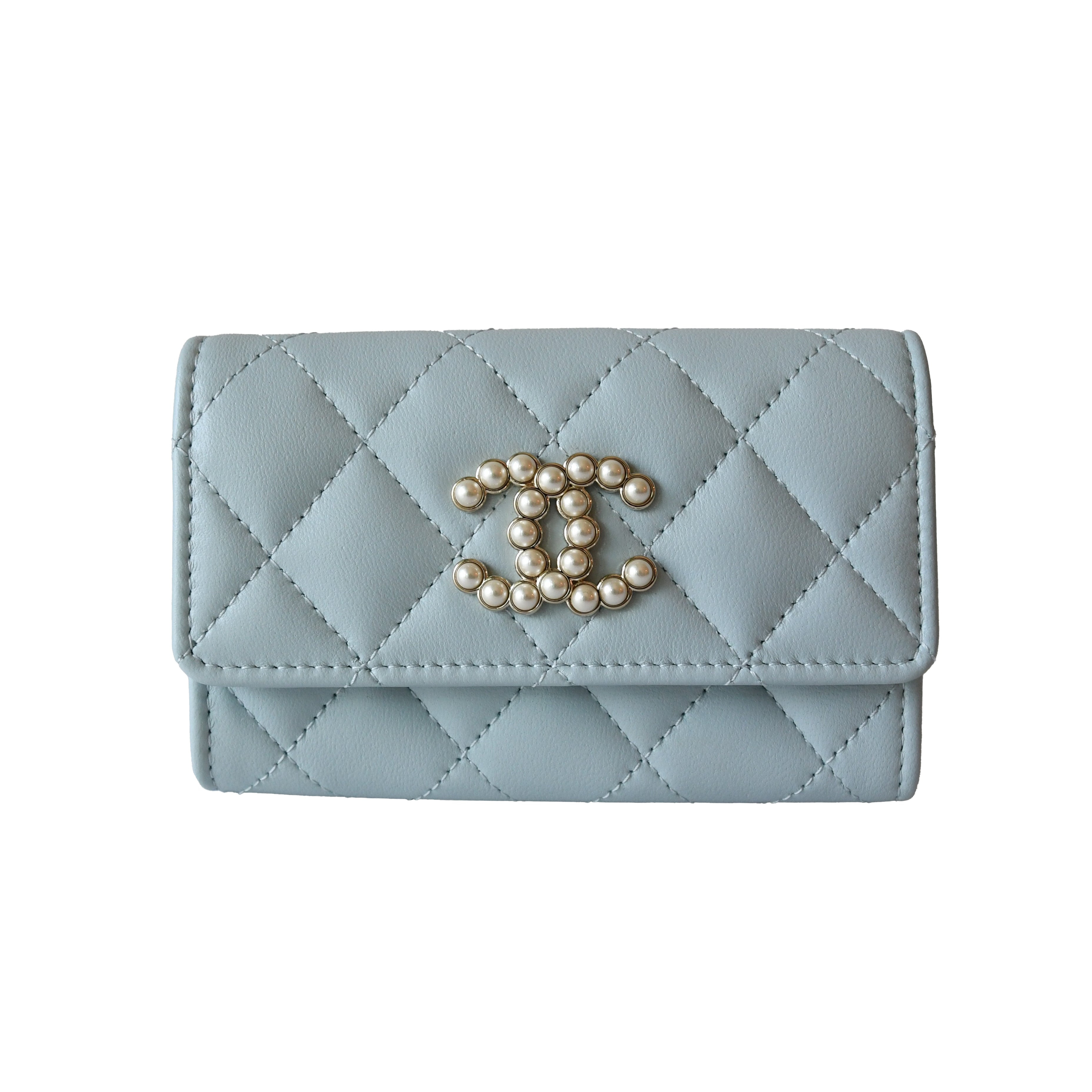 Chanel Pearl CC Lambskin Quilted Chanel Flap Card Holder Baby Blue
