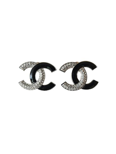 CHANEL CC 2 Tone Crystals Strass Enamel Stud Earrings Silver Black