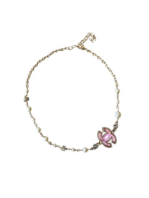 Chanel 24P Crystal Strass Resin CC With Pearl Necklace Pink Gold White