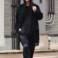 AW18 Velvet striped 'Harlot' shirt in black from Ann Demeulemeester. Material: 71% rayon, 29% silk Tagged S, fits oversized and long. Measurements on request. Worn sparingly, in very good condition without flaws. Trading for blue or black in XS or XXS.