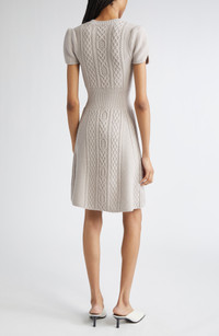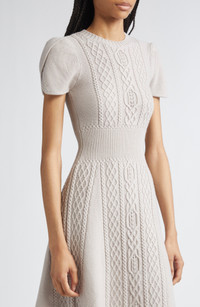 Cozy cable stitching enhances the warmth and polish of this woolly puff-sleeve sweater-dress knit with waistline ribbing to shape the silhouette. Slips on over head Crewneck Short sleeves 100% wool Dry clean Imported