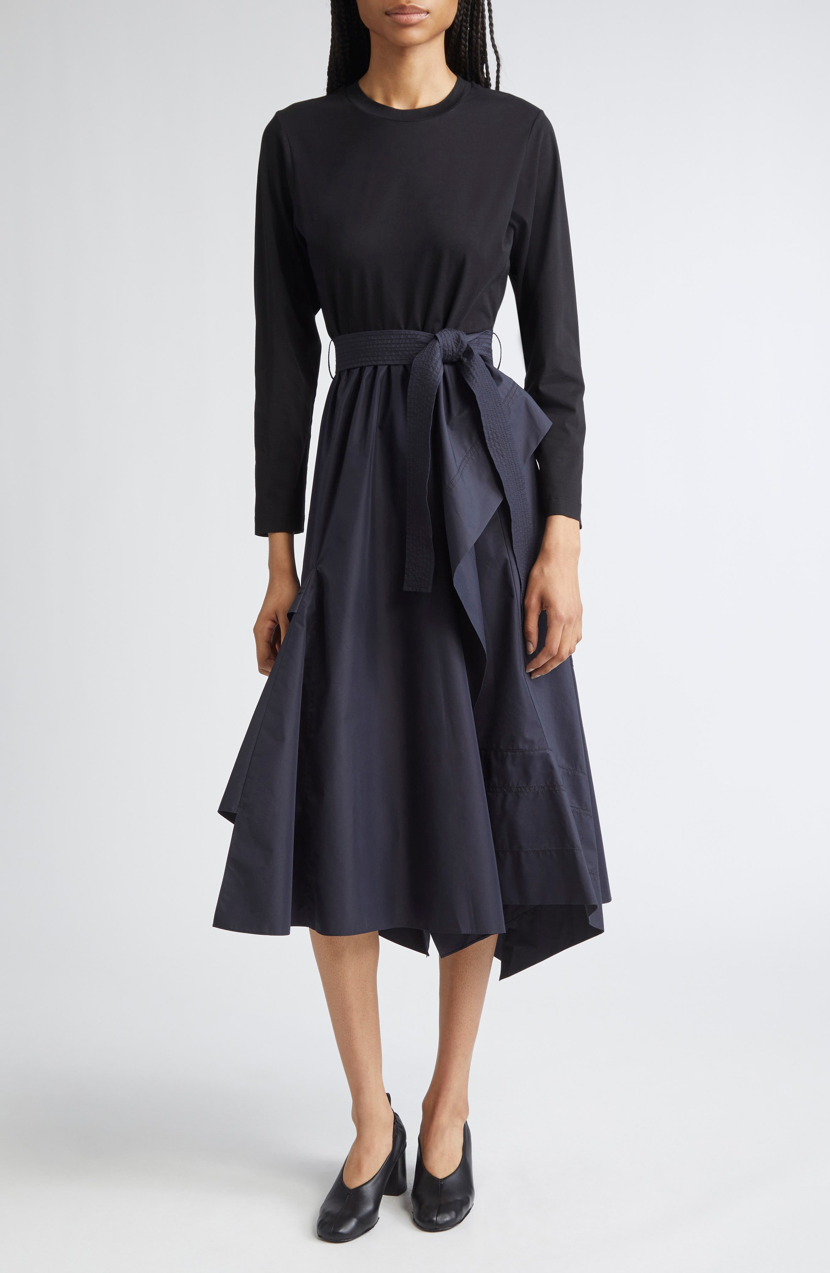 3.1 Phillip Lim Mixed Media Long Sleeve Handkerchief Hem Cotton Blend Dress in Black/Midnight at Nor