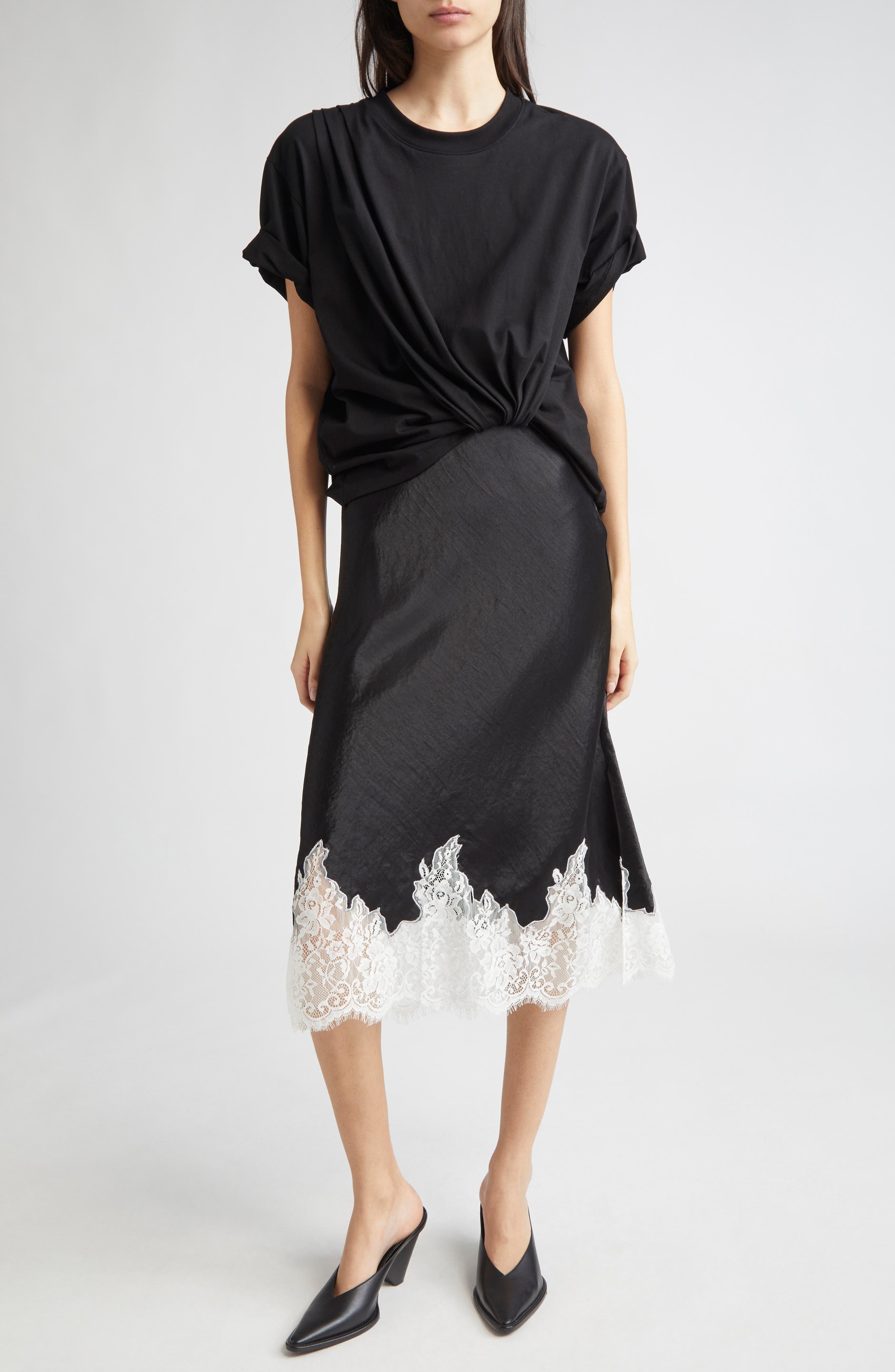 A satin skirt with lacy trim provides a sophisticated contrast to the knit top of this eye-catching mixed-media dress. Slips on over head Crewneck Short sleeves Unlined 100% cotton with 100% acetate contrast Dry clean Imported