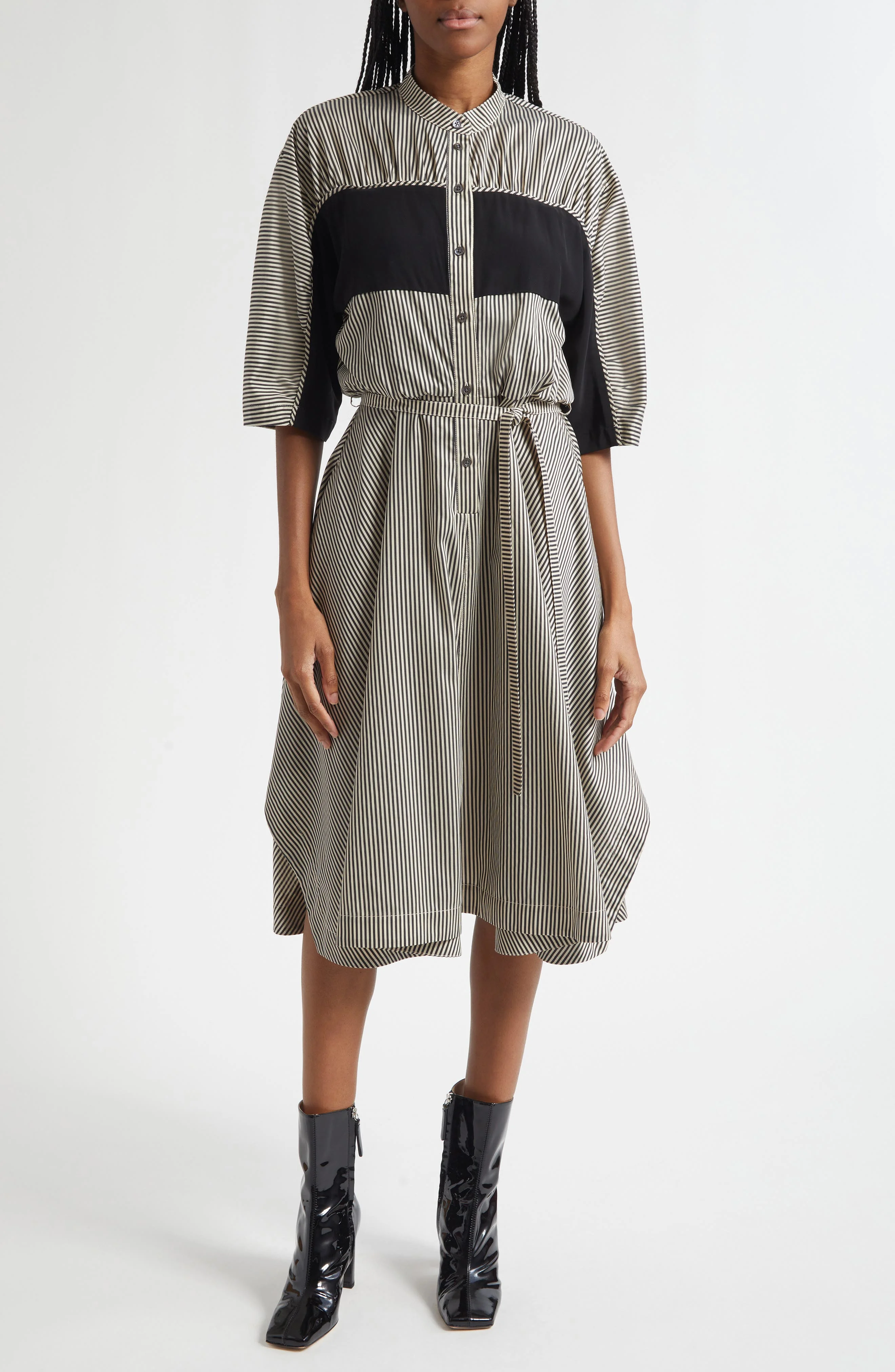 Crisp stripes and a sold contrast panel define this mixed-media midi dress cinched with a removable tie belt. Band collar Front button closure Elbow-length sleeves Removable waist tie 86% tencel, 14% polyamide Dry clean Imported