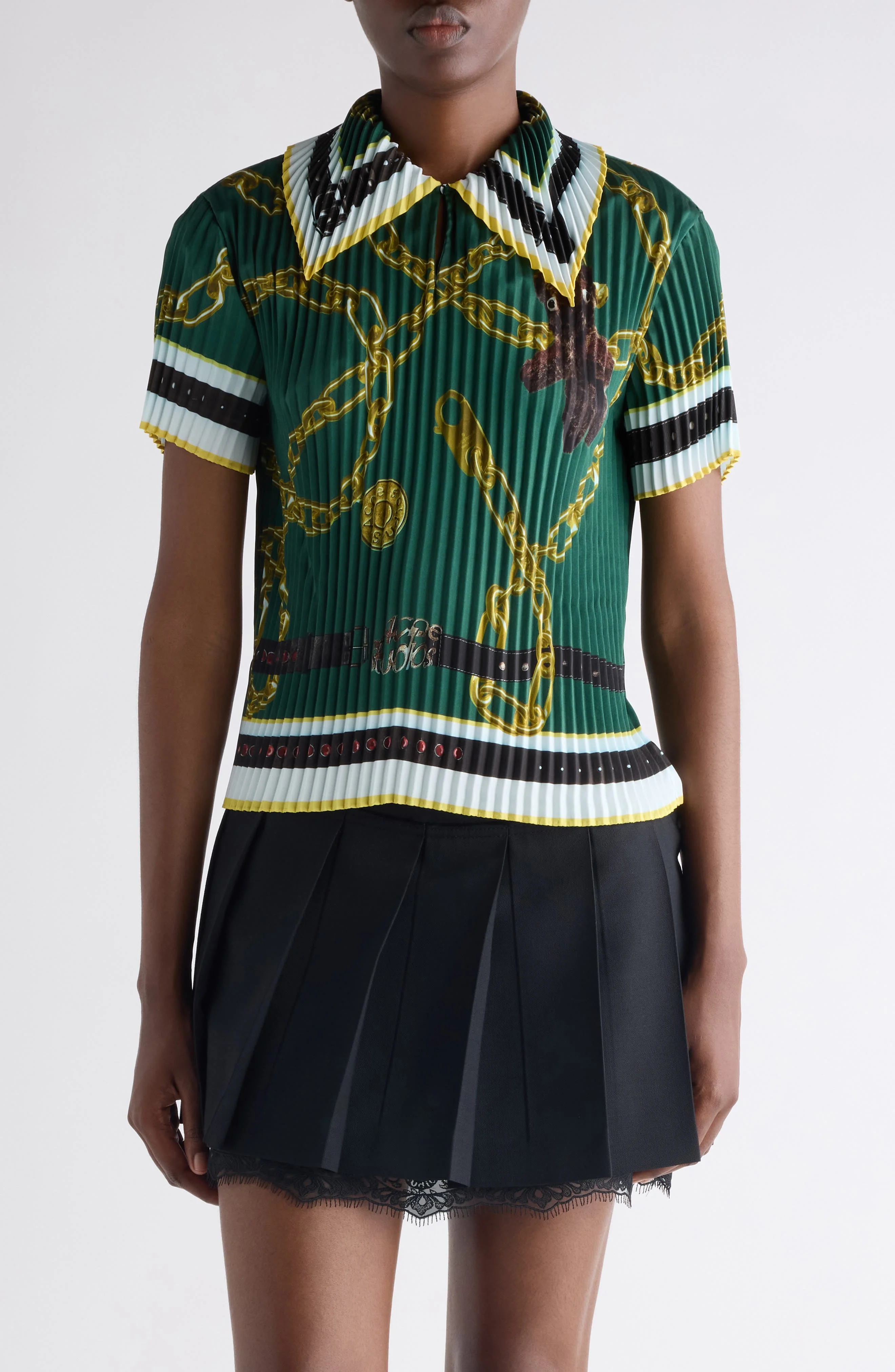 The label's new-for-the-season chain print animates this polo-inspired top cut from fluid twill textured with allover pleating. Front keyhole with button-and-loop closure Spread collar Short sleeves 100% recycled polyester Hand wash, line dry Imported Designer Clothing