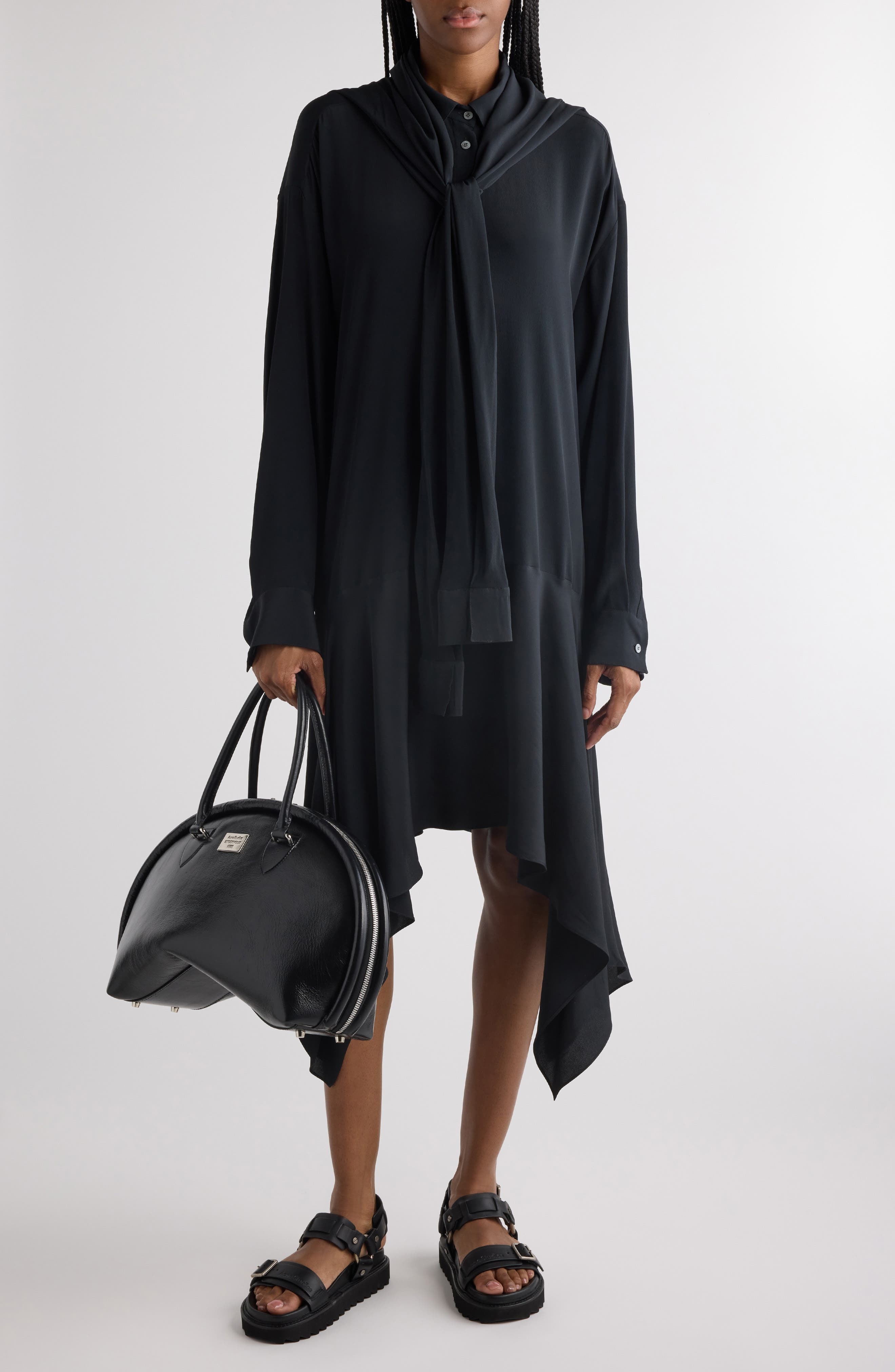 Acne Studios Delouse Long Sleeve Shirtdress with Removable Scarf in Black at Nordstrom
