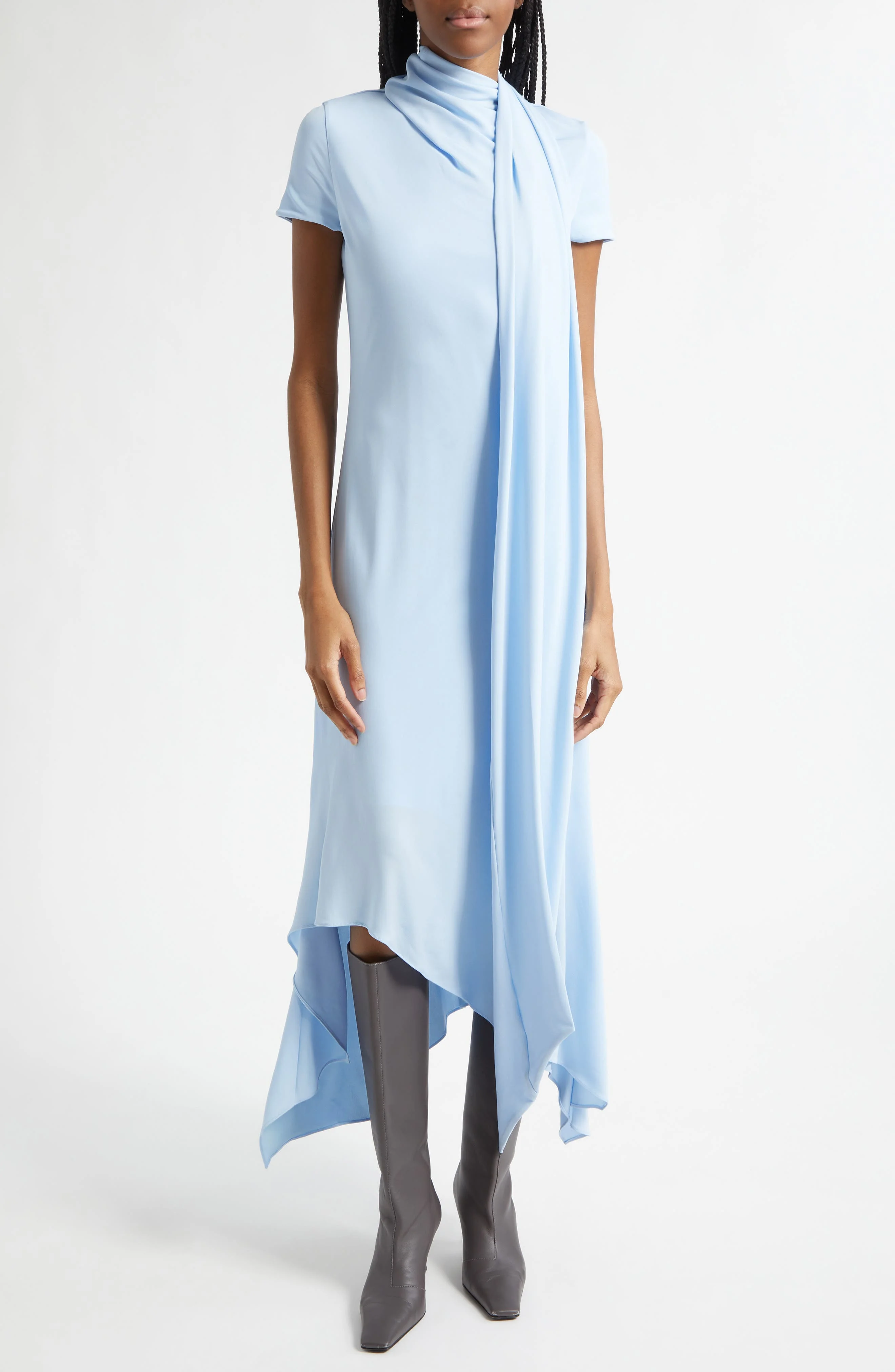 Asymmetry earns its applause with the bias-cut drape of this midi made from viscose crepe in a sky-blue hue. 40" to 56" length Asymmetric cowl neck Short sleeves Lined 100% viscose Dry clean Imported Designer Clothing
