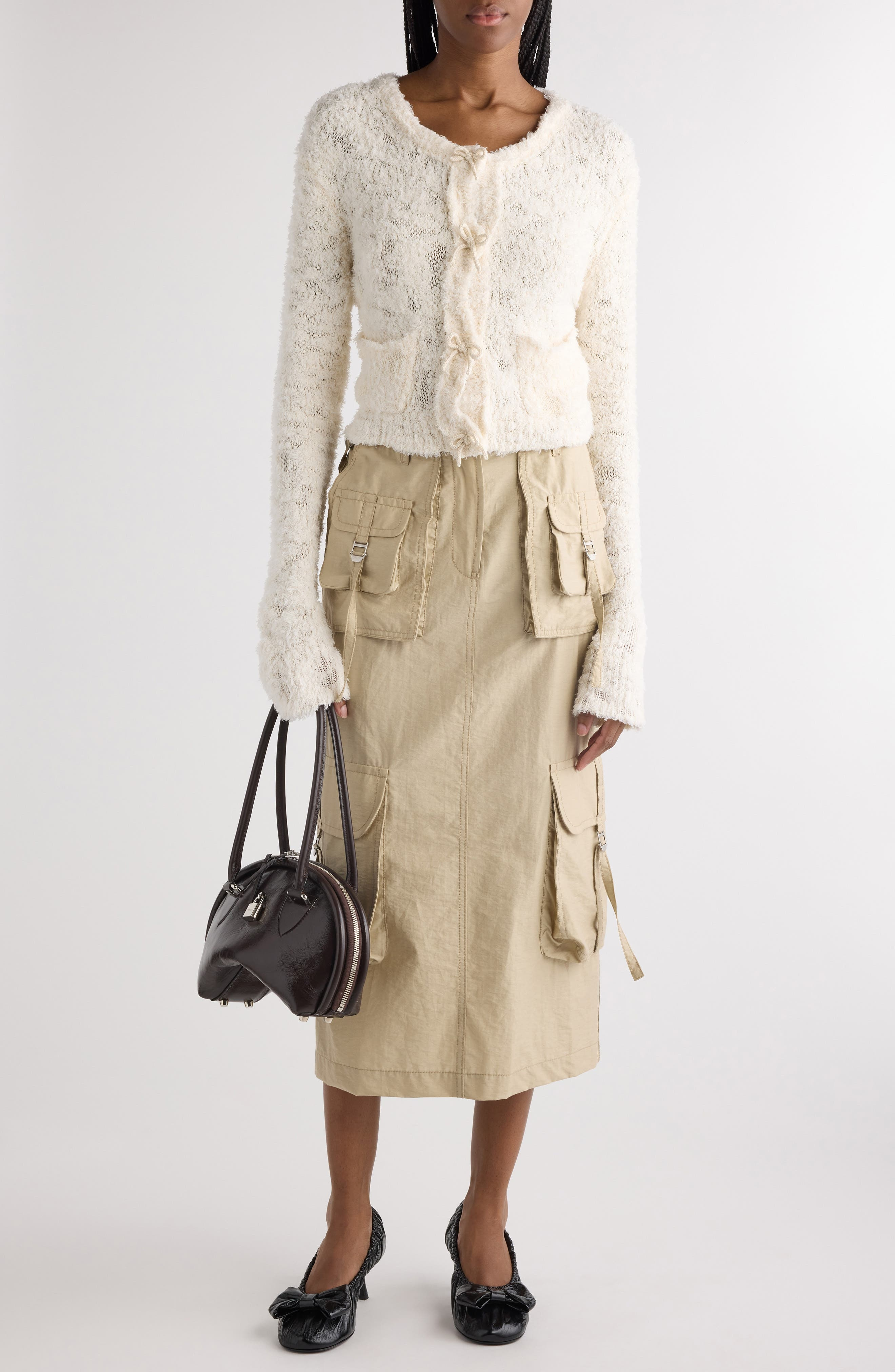 Hewing to the theme of carefully curated disarray that dominated the label's spring '25 runway, this wool-blend cardigan features a shunken fit and threadbare patches suggestive of a laundry mishap. Front button closure Jewel neck Long sleeves 60% wool, 15% alpaca, 13% recycled nylon, 12% nylon Dry clean Imported Designer Clothing