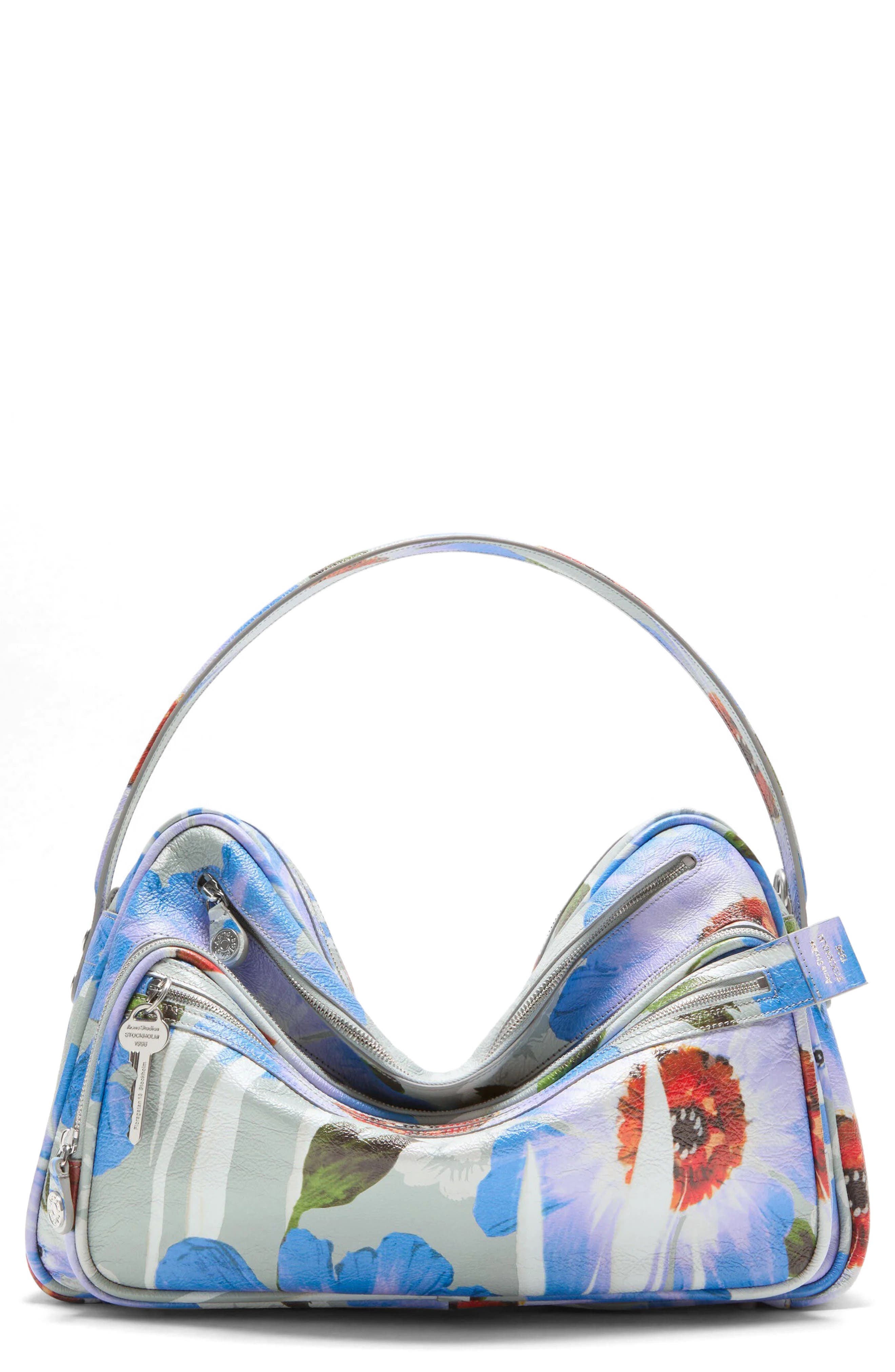The Stockholm label features its '25 flower-powered seasonal motif with this midsized leather shoulder bag detailed with unique hardware inspired by ACNE's iconic denim. Two-way top-zip closure Top carry handle; removable, adjustable crossbody strap Two exterior zip pockets; back slip pocket Interior slip wall pocket Lined Leather Made in Italy Designer Handbags