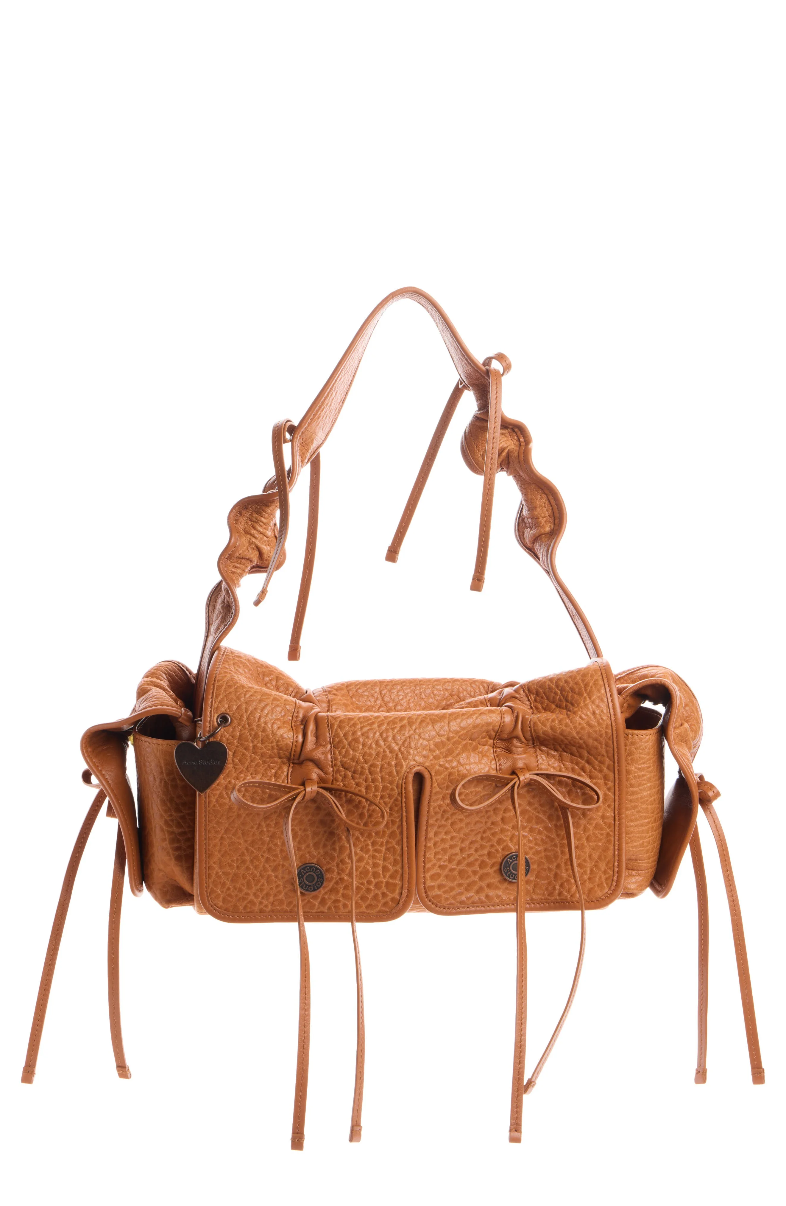 Texture and structure collude to grab all the attention in this Italian-made baguette bag crafted from large-grained lambskin leather and topped with a ruffled shoulder strap. The multipocketed construction is detailed with knotted lacing and jean-inspired embossed buttons for added gleam. A logo-engraved heart adds a playful signature to the look. Magnetic-flap closure Shoulder strap Exterior side magnetic-flap pockets Interior wall pocket Lambskin-leather lining Leather Made in Italy Designer Handbags