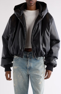 Accentuated by dropped shoulders and voluminous sleeves, an oversized silhouette defines this hooded bomber jacket cut from faux leather that offers all the supple swagger of the real deal. Two-way front-zip closure Fixed hood Ribbed cuffs Side-seam pockets Lined, with 100% polyester fill 100% polyester with polyurethane coating Spot clean Imported Designer Clothing