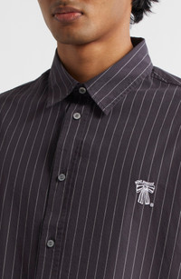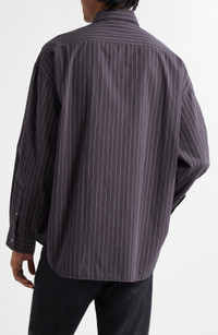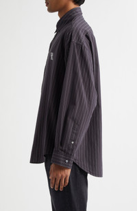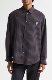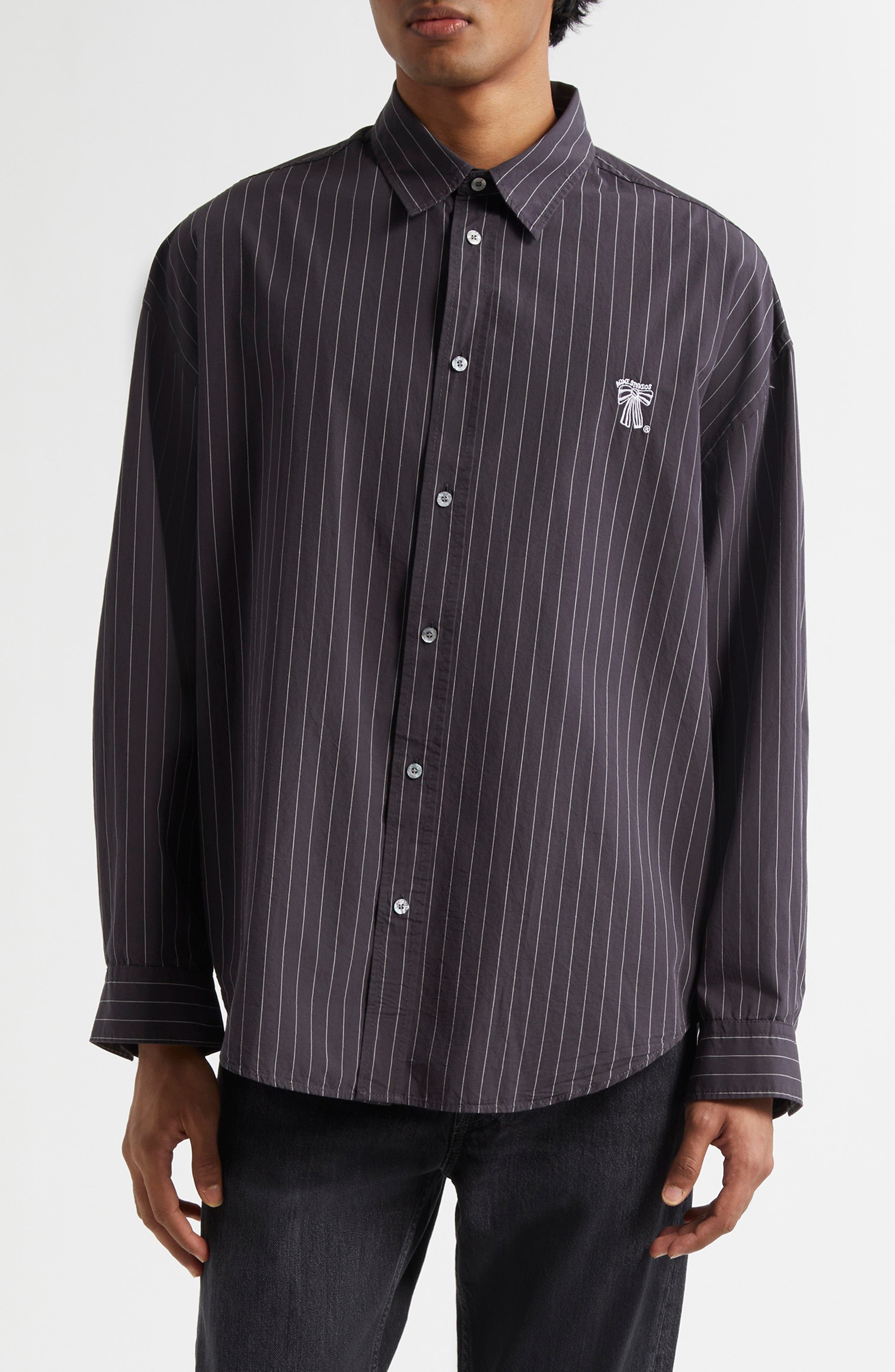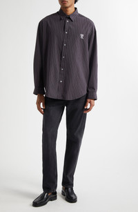 A crisp pinstripe pattern and impeccable stitching are countered by a super-relaxed cut and psychedelia-inspired logo embroidery on this organic-cotton button-up that's ready to rock the office. Front button closure Spread collar Long sleeves with button cuffs Dropped shoulders Curved hem 100% organic cotton Dry clean Imported Designer Clothing