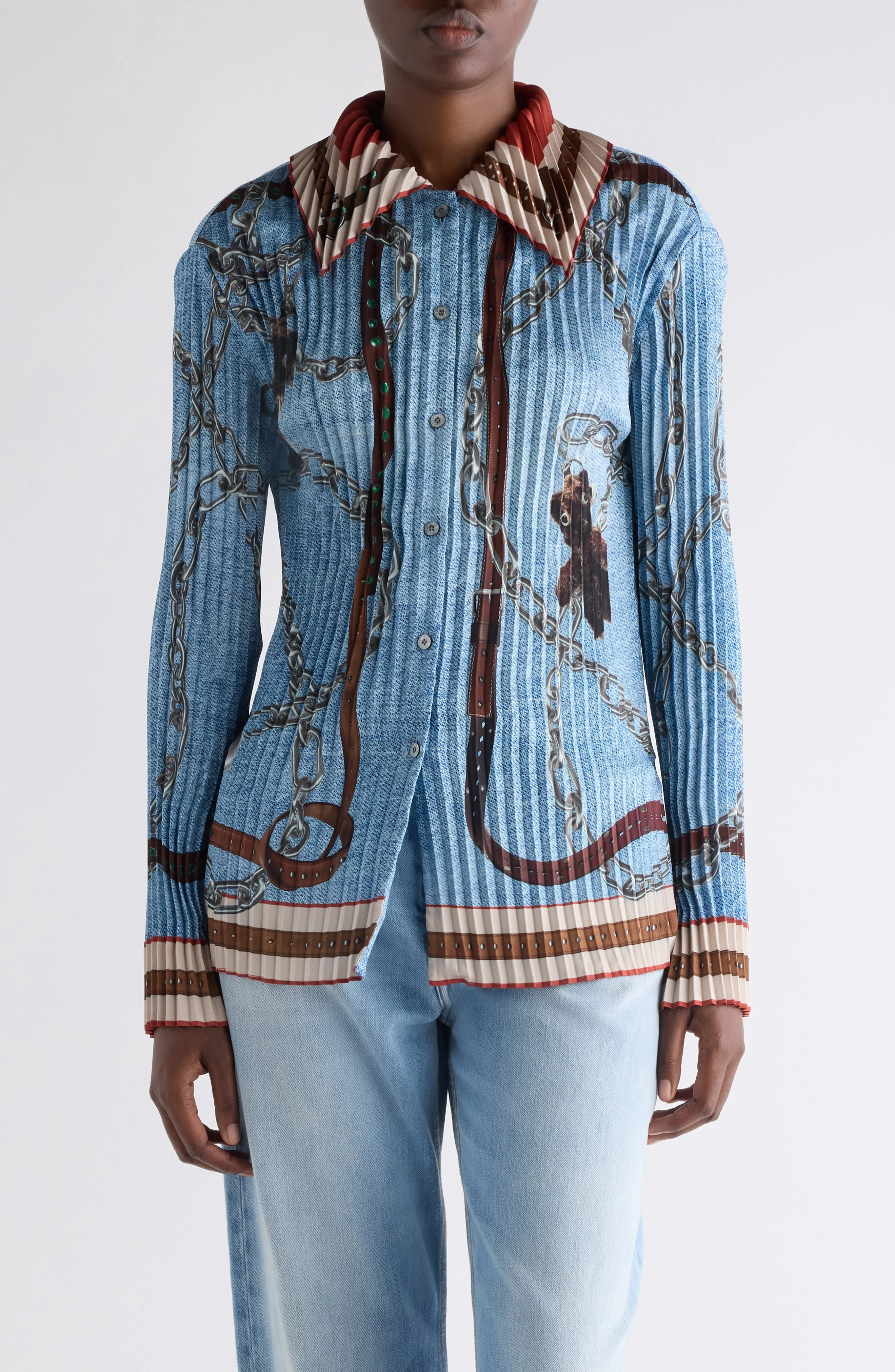 This hip-length button-up shirt is crafted from fluid pleated fabric in a humorous equestrian-style print, while a contrast pleated scarf forms the collar. Front button closure Point collar 100% polyester Dry clean Imported Designer Clothing