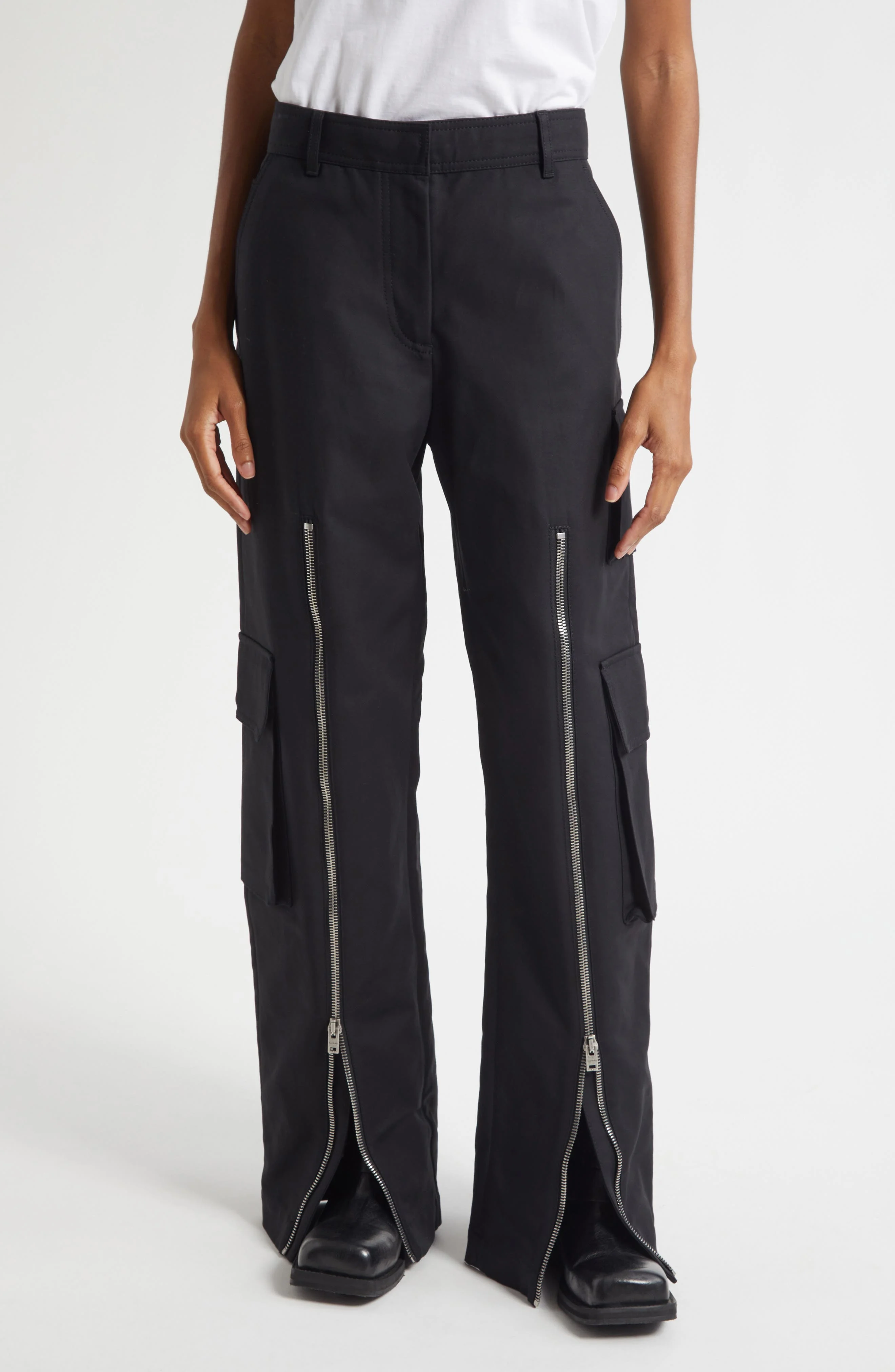Made from two layers of organic-cotton sateen, these straight-leg cargo pants feature functional front zips that open to widen the silhouette. Zip fly with hook-and-bar closure Front slant pockets; cargo flap-patch pockets; back flap-patch pocket 100% organic cotton Dry clean Imported Designer Clothing