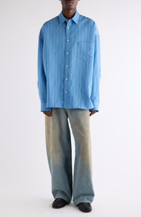 A logo patch on the back yoke subtly brands this striped button-up shirt rendered in a boxy, oversized cut emphasized by the dropped shoulder seams. Front button closure Point collar Long sleeves with button cuffs Dropped shoulders Chest patch pocket 84% lyocell, 16% polyester Dry clean Imported Designer Clothing