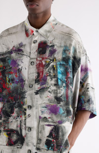 A wearable canvas of controlled chaos, this oversized button-up redefines artistic expression. Cut from structured twill, it showcases a riot of vivid paint smudges that feel straight out of the studio. At the back, a trompe l’oeil belt adds a playful, streetwise twist. Front button closure Point collar Elbow-length sleeves Dropped shoulders Curved hem 100% viscose Dry clean Imported Designer Clothing