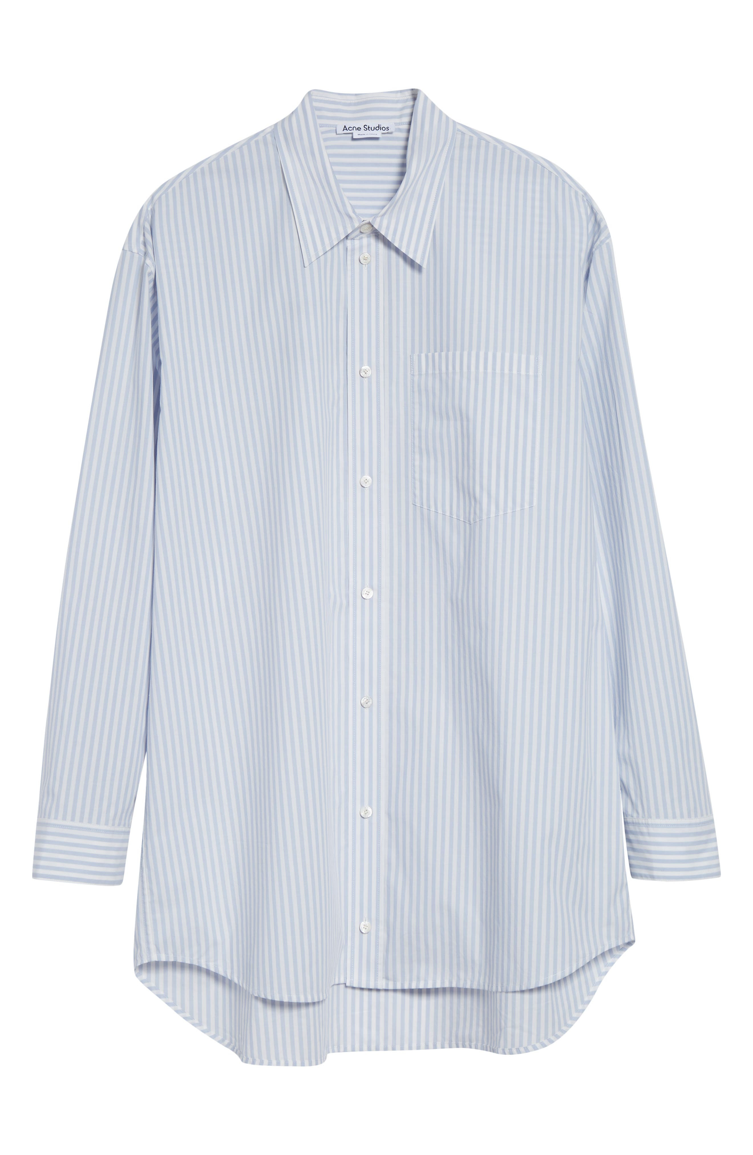 A bold logo graphic at the back lends big brand energy to this striped button-up shirt rendered in a boxy, relaxed cut emphasized by the dropped shoulder seams. Front button closure Point collar Long sleeves with button cuffs Chest patch pocket Dropped shoulders Curved hem 100% organic cotton Machine wash, line dry Imported Designer Clothing