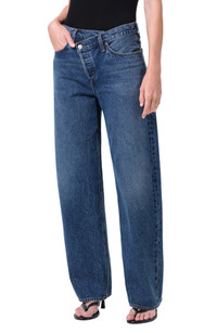 Curved to create a subtle barrel leg, these nonstretch jeans feature a marbled wash and an asymmetric crossover waist that kicks up the trend-right style. 32" inseam; 19 1/2" leg opening; 9 1/2" front rise Button fly Five-pocket style 80% organic cotton, 20% recycled cotton Machine wash, tumble dry Made in Turkey