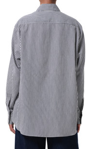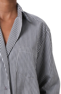 Dropped shoulders enhance the relaxed oversized fit of this striped shirt punctuated with a tuckable high/low hem. 29 1/2" length Front button closure Dropped shoulders Long sleeves with button cuffs 88% viscose, 12% polyester Machine wash, tumble dry Made in Turkey