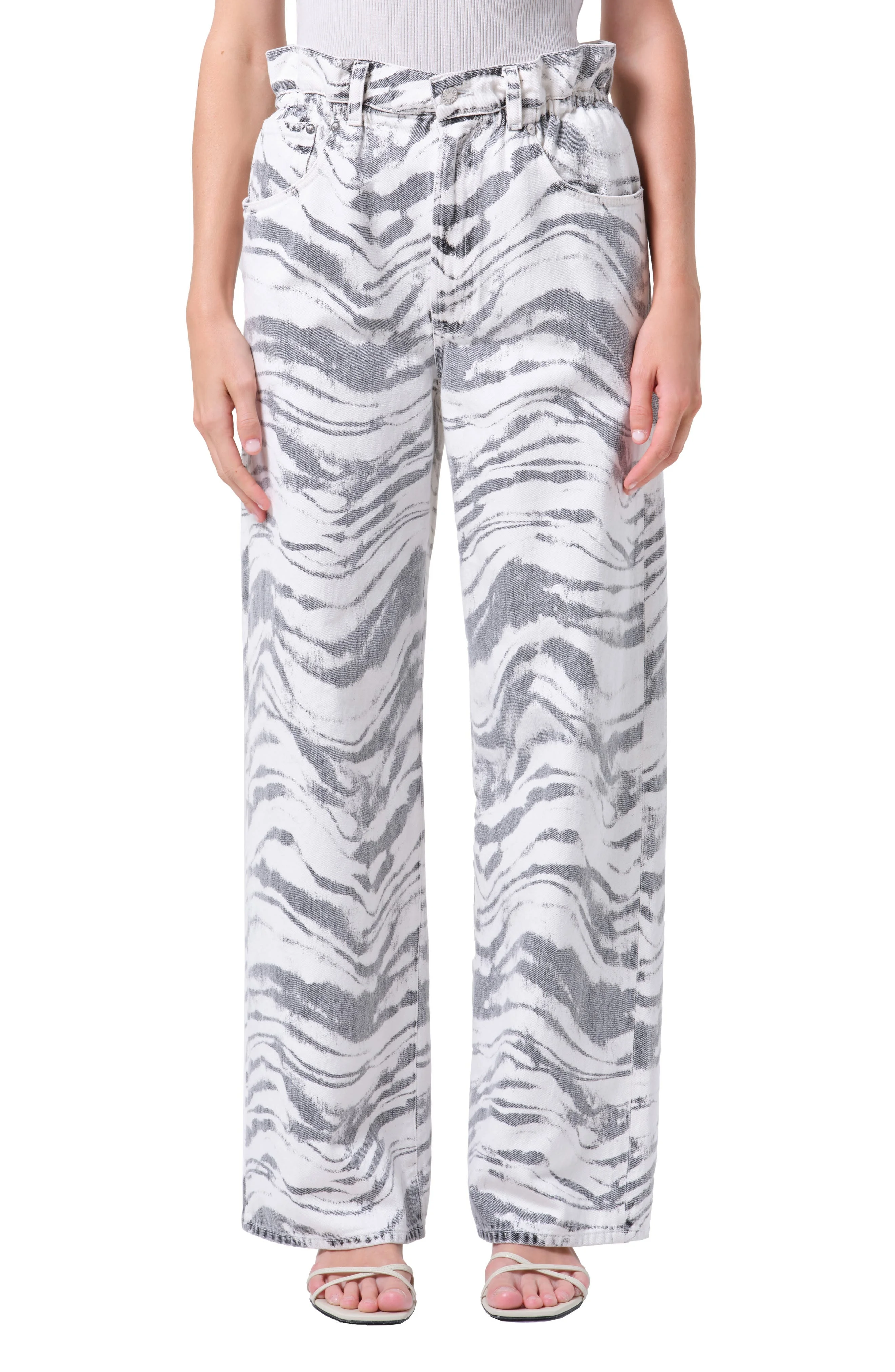 A bold zebra print energizes these timelessly cool jeans cut from nonstretch denim in a wide-leg silhouette. 32" inseam; 21 1/2" leg opening; 12 3/4" front rise Zip fly with button closure Five-pocket style 100% regenerative cotton Machine wash, tumble dry Made in the USA of imported fabric